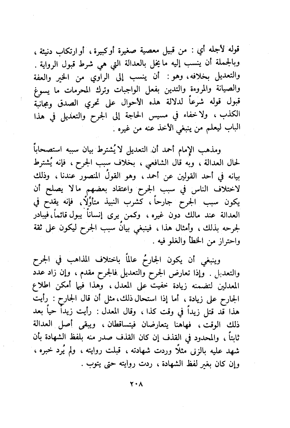قَوْله لأَجله أَي من قبيل مَعْصِيّة صَغِيرَة أَو كَبِيرَة أَو ارْتِكَاب دنيئة وَبِالْجُمْلَةِ أَن ينْسب إِلَيْهِ مَا يخل بِالْعَدَالَةِ الَّتِي هِيَ شَرط قبُول الرِّوَايَة وَالتَّعْدِيل بِخِلَافِهِ وَهُوَ أَن ينْسب إِلَى الرَّاوِي من الْخَبَر والعفة والصيانة والمروءة والتدين بِفعل الْوَاجِبَات وَترك الْمُحرمَات مَا يسوغ قبُول قَوْله شرعا لدلَالَة هَذِه الْأَحْوَال على تحري الصدْق ومجانبة الْكَذِب وَلَا خَفَاء فِي مَسِيس الْحَاجة إِلَى الْجرْح وَالتَّعْدِيل فِي هَذَا الْبَاب ليعلم من يَنْبَغِي الْأَخْذ عَنهُ من غَيره وَمذهب الإِمَام أَحْمد أَن التَّعْدِيل لَا يشْتَرط بَيَان سَببه استصحابا لحَال الْعَدَالَة وَبِه قَالَ الشَّافِعِي بِخِلَاف سَبَب الْجرْح فَإِنَّهُ يشْتَرط بَيَانه فِي أحد الْقَوْلَيْنِ عَن أَحْمد وَهُوَ القَوْل الْمَنْصُور عندنَا وَذَلِكَ لاخْتِلَاف النَّاس فِي سَبَب الْجرْح واعتقاد بَعضهم مَا لَا يصلح أَن يكون سَبَب الْجرْح جارحا كشرب النَّبِيذ متأولا فَإِنَّهُ يقْدَح فِي الْعَدَالَة عِنْد مَالك دون غَيره وَكَمن يرى إنْسَانا يَبُول قَائِما فيبادر لجرحه بذلك وأمثال هَذَا فَيَنْبَغِي بَيَان سَبَب الْجرْح ليَكُون على ثِقَة واحتراز من الْخَطَأ والغلو فِيهِ وَيَنْبَغِي أَن يكون الْجَارِح عَالما باخْتلَاف الْمذَاهب فِي الْجرْح وَالتَّعْدِيل وَإِذ تعَارض الْجرْح وَالتَّعْدِيل فالجرح مقدم وَإِن زَاد عدد المعدلين لتَضَمّنه زِيَادَة خفيت على الْمعدل وَهَذَا فِيمَا أمكن اطلَاع الْجَارِح على زِيَادَة مَا إِذا اسْتَحَالَ ذَلِك مثل أَن قَالَ الْجَارِح رَأَيْت هَذَا قد قتل زيدا فِي وَقت كَذَا وَقَالَ الْمعدل رَأَيْت زيدا حَيا بعد ذَلِك الْوَقْت فههنا يتعارضان فيتساقطان وَيبقى أصل الْعَدَالَة ثَابتا والمحدود فِي الْقَذْف إِن كَانَ الْقَذْف صدر مِنْهُ بِلَفْظ الشَّهَادَة بِأَن شهد عَلَيْهِ بِالزِّنَا مثلا وَردت شَهَادَته قبلت رِوَايَته وَلم يرد خَبره وَإِن كَانَ بِغَيْر لفظ الشَّهَادَة ردَّتْ رِوَايَته حَتَّى يَتُوب