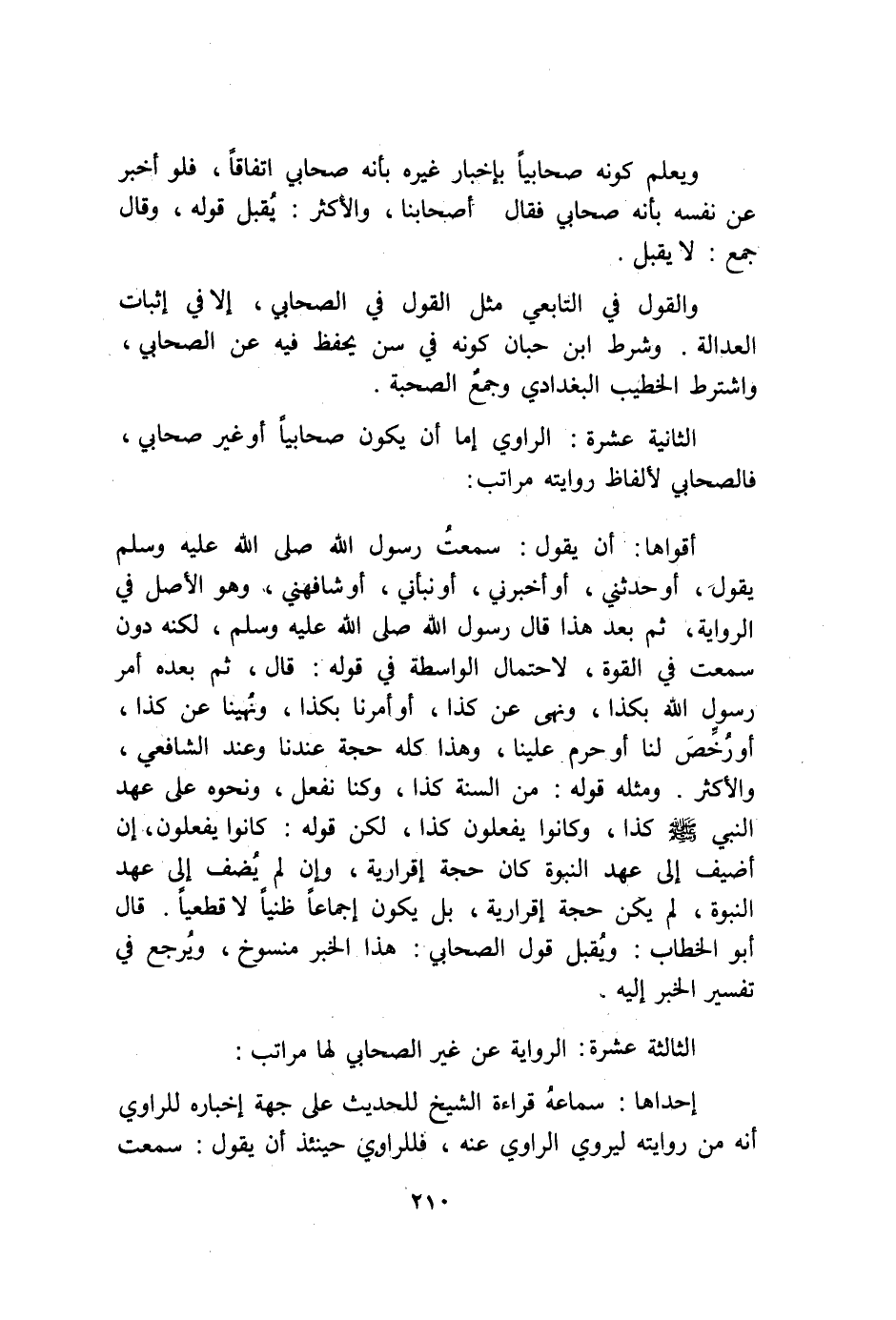 الثَّانِيَة عشرَة الرَّاوِي إِمَّا أَن يكون صحابيا أَو غير صَحَابِيّ فالصحابي لألفاظ رِوَايَته مَرَاتِب أقواها أَن يَقُول سَمِعت رَسُول الله صلى الله عَلَيْهِ وَسلم يَقُول أَو حَدثنِي أَو أَخْبرنِي أَو نَبَّأَنِي أَو شافهني وَهُوَ الأَصْل فِي الرِّوَايَة ثمَّ بعد هَذَا قَالَ رَسُول الله صلى الله عَلَيْهِ وَسلم لكنه دون سَمِعت فِي الْقُوَّة لاحْتِمَال الْوَاسِطَة فِي قَوْله قَالَ ثمَّ بعده أَمر رَسُول الله بِكَذَا وَنهى عَن كَذَا أَو أمرنَا بِكَذَا ونهينا عَن كَذَا أَو رخص لنا أَو حرم علينا وَهَذَا كُله حجَّة عندنَا وَعند الشَّافِعِي وَالْأَكْثَر وَمثله قَوْله من السّنة كَذَا وَكُنَّا نَفْعل وَنَحْوه على عهد النَّبِي صلى الله عَلَيْهِ وَسلم كَذَا وَكَانُوا يَفْعَلُونَ كَذَا لَكِن قَوْله كَانُوا يَفْعَلُونَ إِن أضيف إِلَى عهد النُّبُوَّة كَانَ حجَّة إقرارية وَإِن لم يضف إِلَى عهد النُّبُوَّة لم يكن حجَّة إقرارية بل يكون إِجْمَاعًا ظنيا لَا قَطْعِيا قَالَ أَبُو الْخطاب وَيقبل قَول الصَّحَابِيّ هَذَا الْخَبَر مَنْسُوخ وَيرجع فِي تَفْسِير الْخَبَر إِلَيْهِ