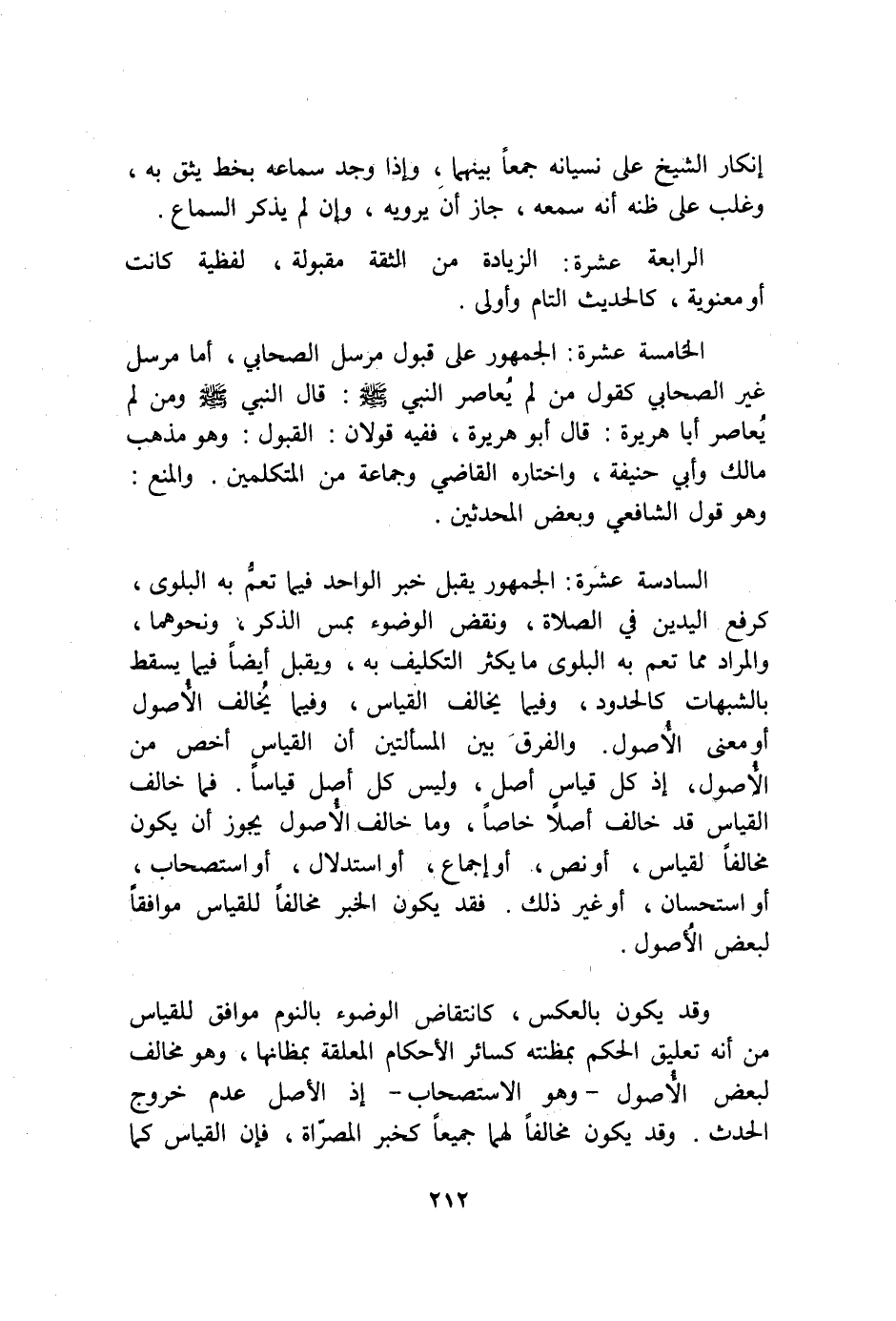 الْخَامِسَة عشر الْجُمْهُور على قبُول مُرْسل الصَّحَابِيّ أما مُرْسل غير الصَّحَابِيّ كَقَوْل من لم يعاصر النَّبِي صلى الله عَلَيْهِ وَسلم قَالَ النَّبِي صلى الله عَلَيْهِ وَسلم وَمن لم يعاصر أَبَا هُرَيْرَة قَالَ أَبُو هُرَيْرَة فَفِيهِ قَولَانِ الْقبُول وَهُوَ مَذْهَب مَالك وَأبي حنيفَة وَاخْتَارَهُ القَاضِي وَجَمَاعَة من الْمُتَكَلِّمين