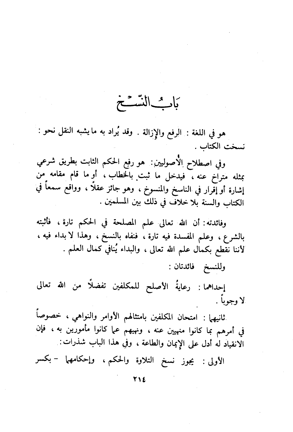 هُوَ فِي اللُّغَة الرّفْع والإزالة وَقد يُرَاد بِهِ مَا يشبه النَّقْل نَحْو نسخت الْكتاب وَفِي اصْطِلَاح الْأُصُولِيِّينَ هُوَ رفع الحكم الثَّابِت بطرِيق شَرْعِي بِمثلِهِ متراخ عَنهُ فَيدْخل مَا ثَبت بِالْخِطَابِ أَو مَا قَامَ مقَامه من إِشَارَة أَو إِقْرَار فِي النَّاسِخ والمنسوخ وَهُوَ جَائِز عقلا وواقع سمعا فِي الْكتاب وَالسّنة بِلَا خلاف فِي ذَلِك بَين الْمُسلمين وَفَائِدَته أَن الله تَعَالَى علم الْمصلحَة فِي الحكم تَارَة فأثبته بِالشَّرْعِ وَعلم الْمفْسدَة فِيهِ تَارَة فنفاه بالنسخ وَهَذَا لَا بداء فِيهِ لأننا نقطع بِكَمَال علم الله تَعَالَى والبداء يُنَافِي كَمَال الْعلم وللنسخ فَائِدَتَانِ أَحدهمَا رِعَايَة الْأَصْلَح للمكلفين تفضلا من الله تَعَالَى لَا وجوبا