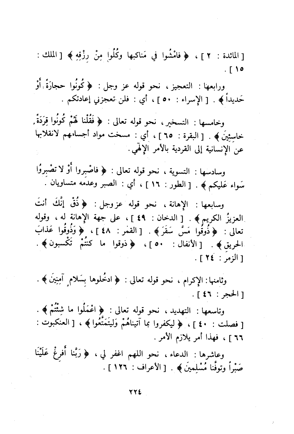 {رَبنَا أَفْرِغْ عَلَيْنَا صَبْراً وَتَوَفَّنَا مُسْلِمِينَ} الْأَعْرَاف 126 وحادي عشرهَا الْخَبَر كَحَدِيث إِذا أَنْت لم تَسْتَحي فَاصْنَعْ مَا شِئْت وَثَانِي عشرهَا التَّمَنِّي كَقَوْل امرىء الْقَيْس أَلا أَيهَا اللَّيْل الطَّوِيل أَلا انجلي أَي أَتَمَنَّى انجلاءك عني