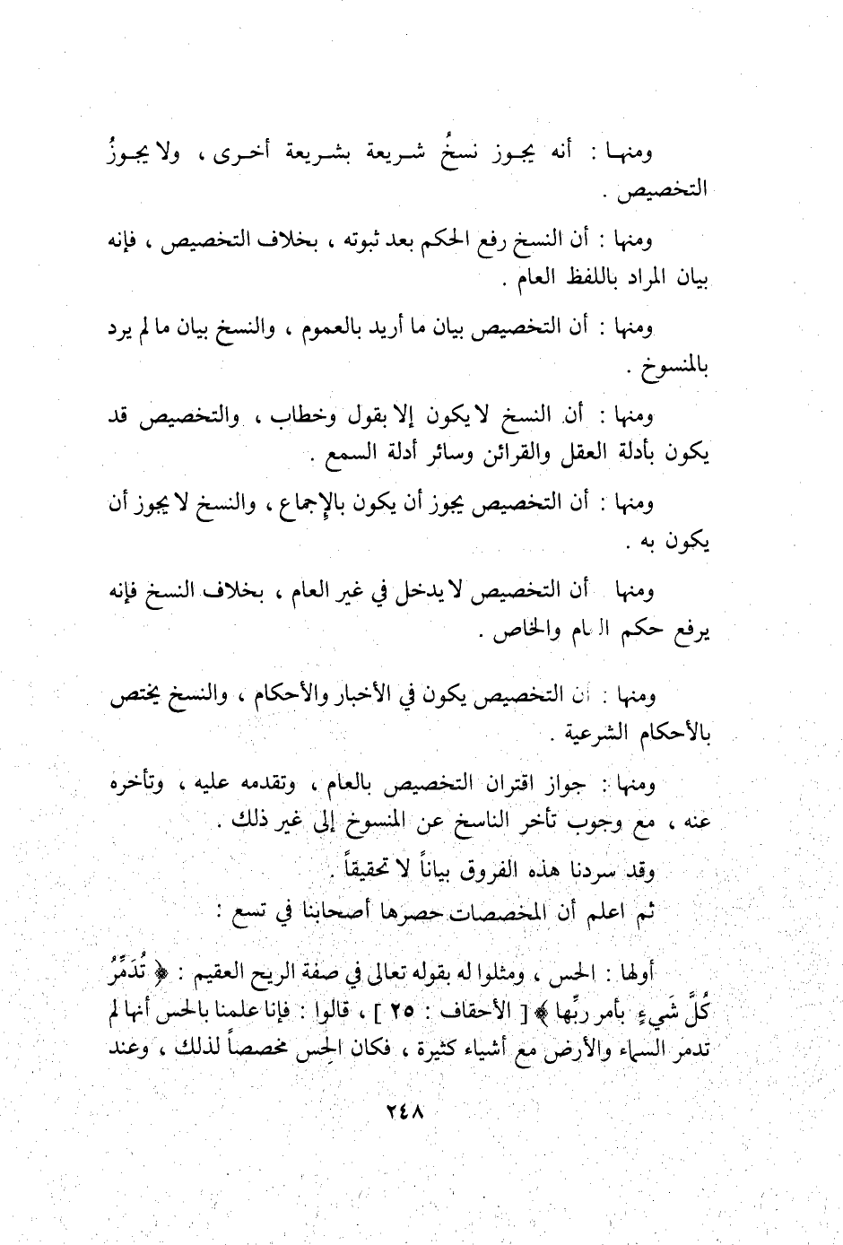 وَقد سردنا هَذِه الفروق بَيَانا لَا تَحْقِيقا ثمَّ اعْلَم أَن المخصصات حصرها أَصْحَابنَا فِي تسع أَولهَا الْحسن ومثلوا لَهُ بقوله تَعَالَى فِي صفة الرّيح الْعَقِيم {تدمر كل شَيْء بِأَمْر رَبهَا فَأَصْبحُوا لَا} الْأَحْقَاف 25 قَالُوا فَإنَّا علمنَا بالحس أَنَّهَا لم تدمر السَّمَاء وَالْأَرْض مَعَ أَشْيَاء كَثِيرَة فَكَانَ الْحس مُخَصّصا لذَلِك وَعند التَّحْقِيق تَجِد الْآيَة خَاصَّة أُرِيد بهَا الْخَاص وَذَلِكَ لِأَنَّهَا جَاءَت فِي مَوضِع آخر مُقَيّدَة بِمَا يمْنَع الِاسْتِدْلَال بهَا على الْمُدَّعِي وَهُوَ قَوْله عز وَجل {وَفِي عَادٍ إِذْ أَرْسَلْنَا عَلَيْهِمُ الرِّيحَ الْعَقِيمَ مَا تَذَرُ مِنْ شَيْءٍ أَتَتْ عَلَيْهِ إِلَّا جعلته كالرميم}
