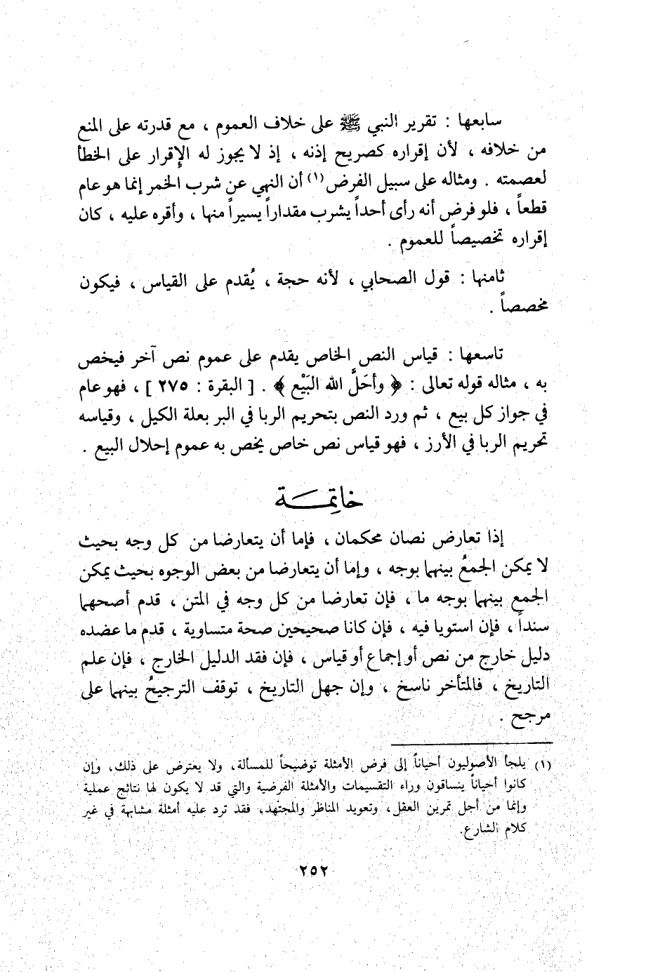 تاسعها قِيَاس النَّص الْخَاص يقدم على عُمُوم نَص آخر فيخص بِهِ مِثَاله قَوْله تَعَالَى {وَأَحَلَّ اللَّهُ الْبَيْعَ} الْبَقَرَة 275 فَهُوَ عَام فِي جَوَاز كل بيع ثمَّ ورد النَّص بِتَحْرِيم الرِّبَا فِي الْبر بعلة الْكَيْل وَقِيَاسه تَحْرِيم الرِّبَا فِي الْأرز فَهُوَ قِيَاس نَص خَاص يخص بِهِ عُمُوم إحلال البيع