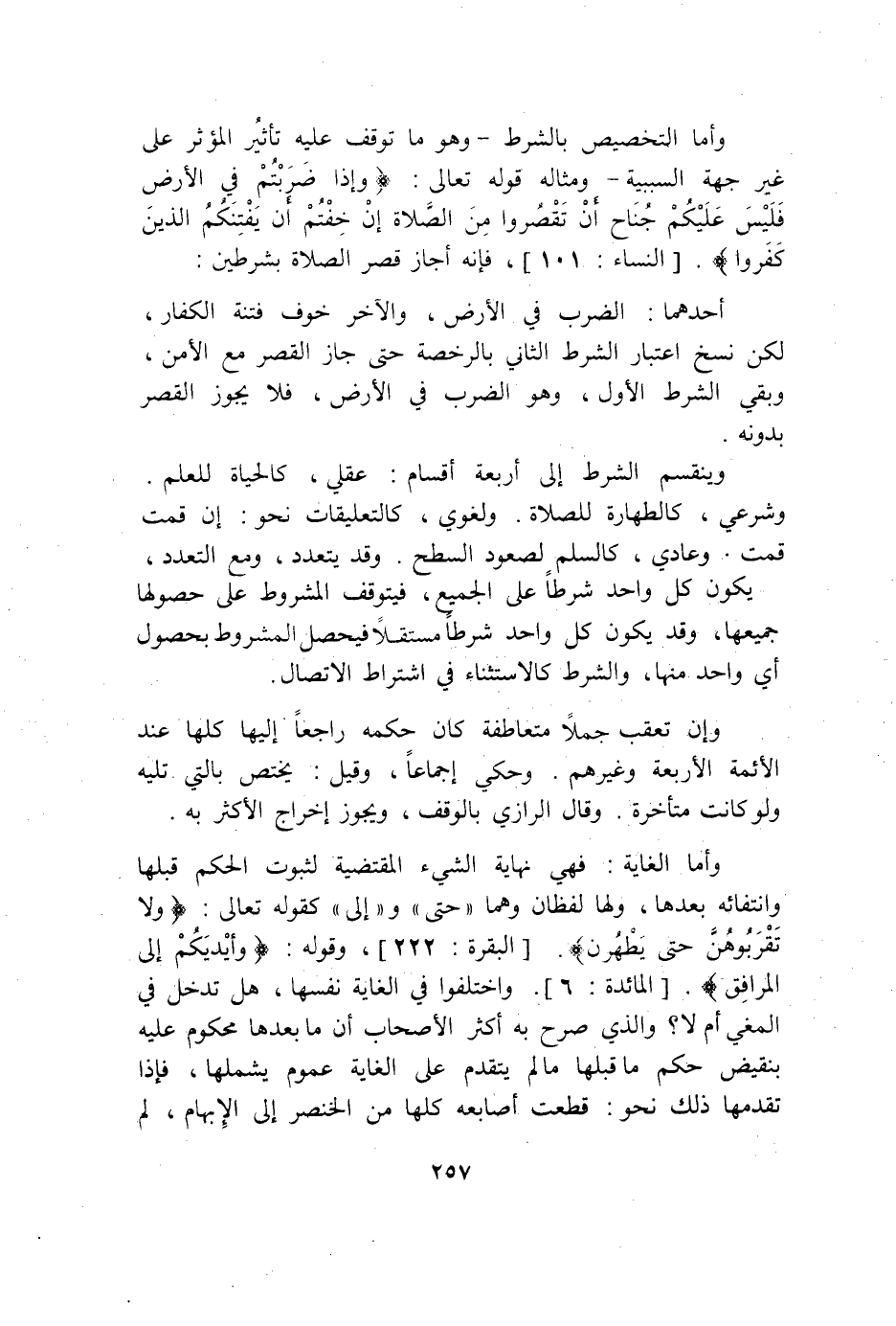 وَأما التَّخْصِيص بِالشّرطِ وَهُوَ مَا توقف عَلَيْهِ تَأْثِير الْمُؤثر على غير جِهَة السَّبَبِيَّة ومثاله قَوْله تَعَالَى {وَإِذَا ضَرَبْتُمْ فِي الْأَرْضِ فَلَيْسَ عَلَيْكُمْ جُنَاحٌ أَنْ تَقْصُرُوا مِنَ الصَّلاةِ إِنْ خِفْتُمْ أَنْ يَفْتِنَكُمُ الَّذِينَ كَفَرُوا} النِّسَاء 101 فَإِنَّهُ أجَاز قصر الصَّلَاة بِشَرْطَيْنِ أَحدهمَا الضَّرْب فِي الأَرْض وَالْآخر خوف فتْنَة الْكفَّار لَكِن نسخ اعْتِبَار الشَّرْط الثَّانِي بِالرُّخْصَةِ حَتَّى جَازَ الْقصر مَعَ الْأَمْن وَبَقِي الشَّرْط الأول وَهُوَ الضَّرْب فِي الأَرْض فَلَا يجوز الْقصر بِدُونِهِ وينقسم الشَّرْط إِلَى أَرْبَعَة أَقسَام عَقْلِي كالحياة للْعلم