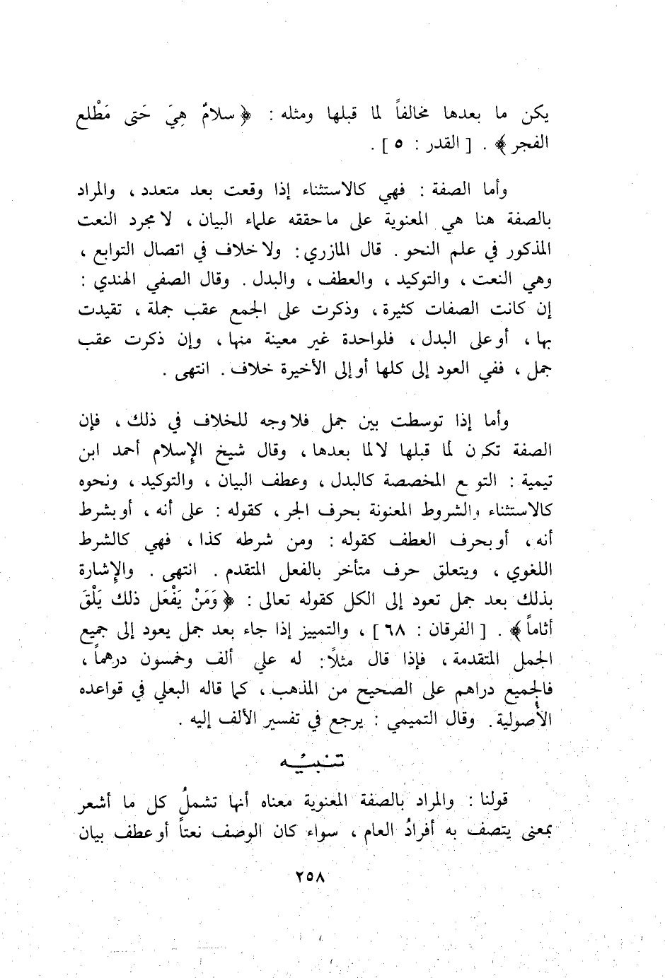 (الْقدر 5) وَأما الصّفة فَهِيَ كالاستثناء إِذا وَقعت بعد مُتَعَدد وَالْمرَاد بِالصّفةِ هُنَا هِيَ المعنوية على مَا حَقَّقَهُ عُلَمَاء الْبَيَان لَا مُجَرّد النَّعْت الْمَذْكُور فِي علم النَّحْو