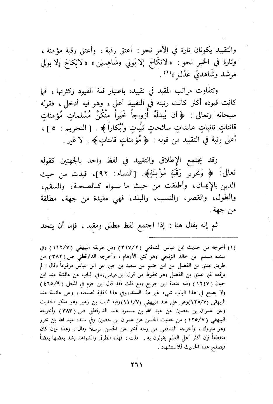 وَالتَّقْيِيد يكونَانِ تَارَة فِي الْأَمر نَحْو أعتق رَقَبَة وَأعْتق رَقَبَة مُؤمنَة وَتارَة فِي الْخَبَر نَحْو لَا نِكَاح إِلَّا بولِي وشاهدين