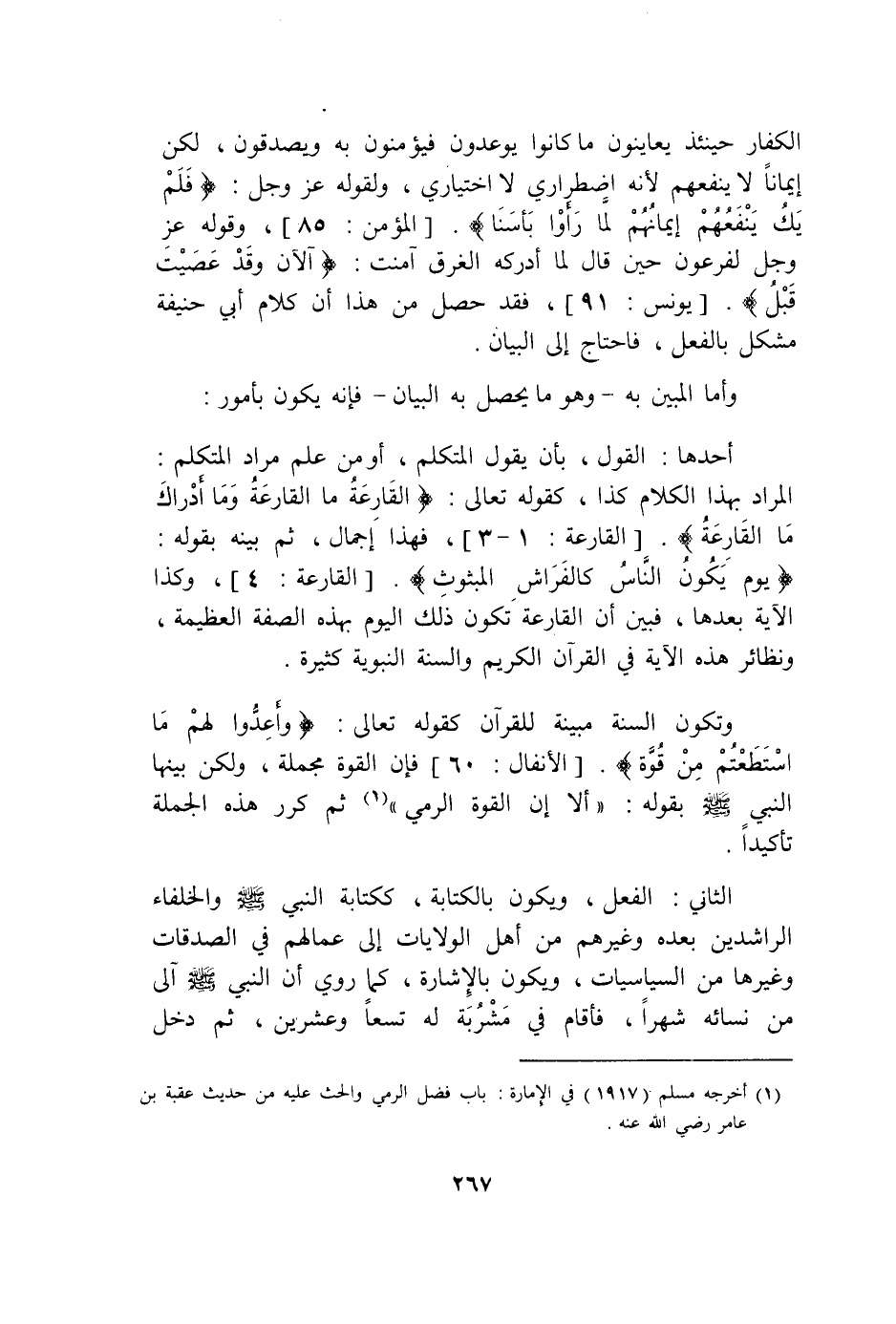 فَهَذَا إِجْمَال ثمَّ بَينه بقوله {يَوْمَ يَكُونُ النَّاسُ كَالْفَرَاشِ الْمَبْثُوثِ} القارعة 4 وَكَذَا الْآيَة بعْدهَا فَبين أَن القارعة تكون ذَلِك الْيَوْم بِهَذِهِ الصّفة الْعَظِيمَة ونظائر هَذِه الْآيَة فِي الْقُرْآن الْكَرِيم وَالسّنة النَّبَوِيَّة كَثِيرَة وَتَكون السّنة مبينَة لِلْقُرْآنِ كَقَوْلِه تَعَالَى {وَأَعِدُّوا لَهُمْ مَا اسْتَطَعْتُمْ مِنْ قُوَّةٍ} الْأَنْفَال 60 فَإِن الْقُوَّة مجملة وَلَكِن بَينهَا النَّبِي صلى الله عَلَيْهِ وَسلم بقوله أَلا إِن الْقُوَّة الرَّمْي