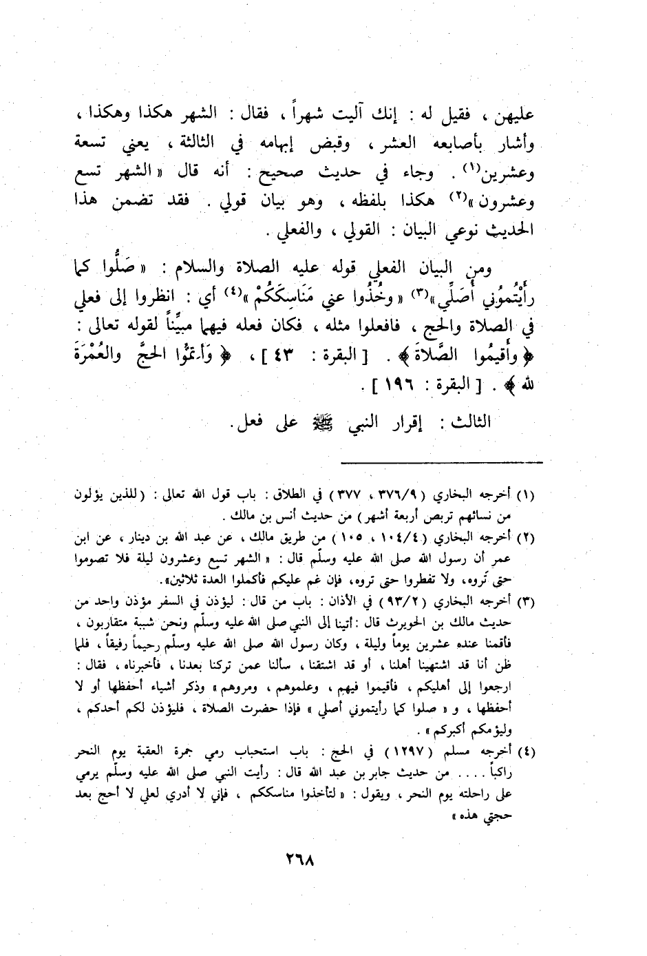 فَقيل لَهُ إِنَّك آلَيْت شهرا فَقَالَ الشَّهْر هَكَذَا وَهَكَذَا وَأَشَارَ بأصابعه الْعشْر وَقبض إبهامه فِي الثَّالِثَة يَعْنِي تِسْعَة وَعشْرين وَجَاء فِي حَدِيث صَحِيح أَنه قَالَ الشَّهْر تسع وَعِشْرُونَ هَكَذَا بِلَفْظِهِ وَهُوَ بَيَان قولي فقد تضمن هَذَا الحَدِيث نَوْعي الْبَيَان القولي والفعلي وَمن الْبَيَان الْفعْلِيّ قَوْله عَلَيْهِ الصَّلَاة وَالسَّلَام صلوا كَمَا رَأَيْتُمُونِي أُصَلِّي وخذوا عني مَنَاسِككُم