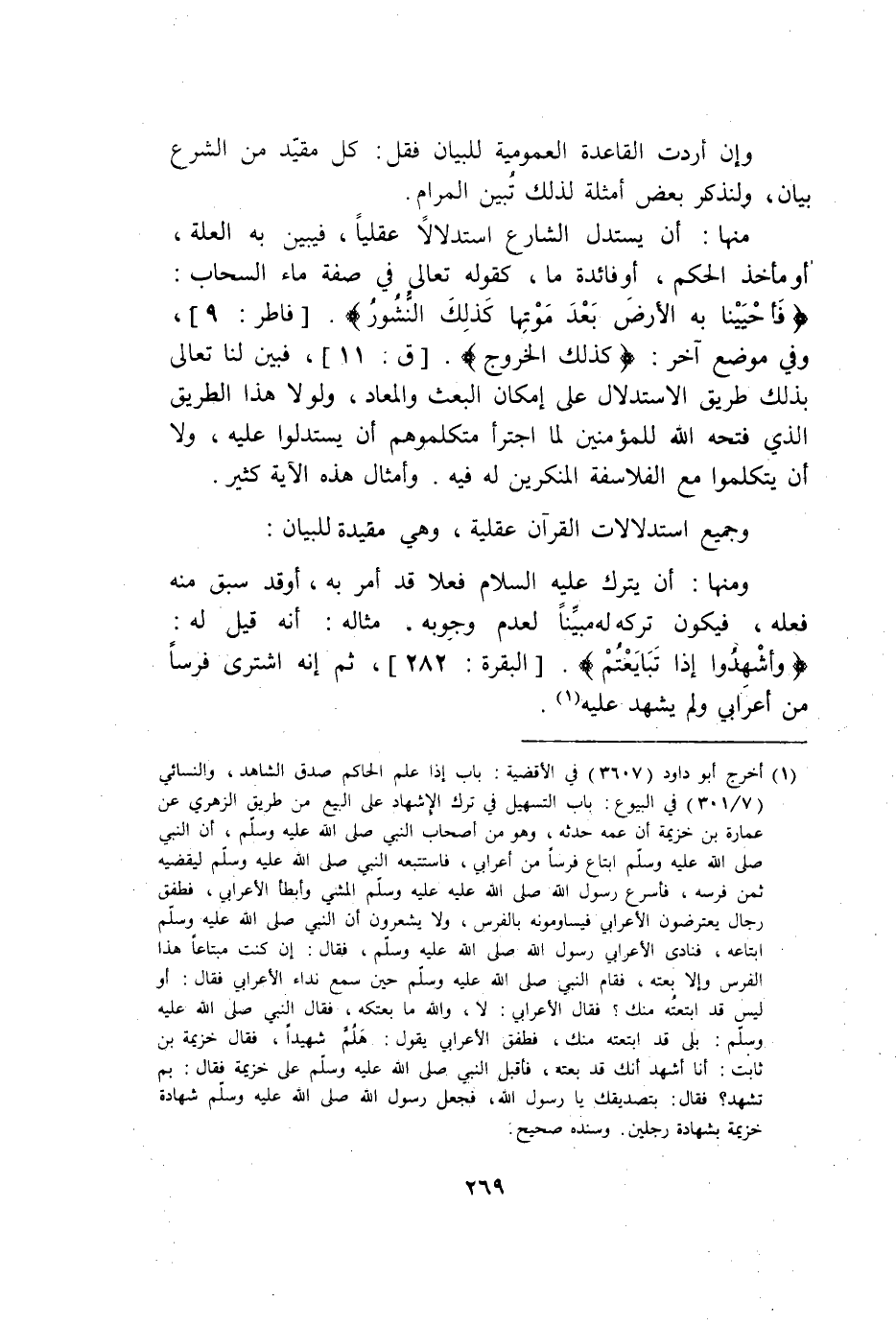 وَمِنْهَا أَن يتْرك عَلَيْهِ السَّلَام فعلا قد أَمر بِهِ أَو قد سبق مِنْهُ فعله فَيكون تَركه لَهُ مُبينًا لعدم وجوب مِثَاله أَنه قيل لَهُ {تكتبوها وَأَشْهِدُوا إِذَا تَبَايَعْتُمْ} الْبَقَرَة 282 ثمَّ إِنَّه اشْترى فرسا من أَعْرَابِي وَلم يشْهد عَلَيْهِ