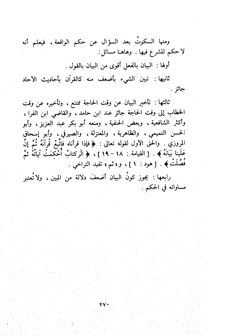 ثَالِثهَا تَأْخِير الْبَيَان عَن وَقت الْحَاجة مُمْتَنع وتأخيره عَن وَقت الْخطاب إِلَى وَقت الْحَاجة جَائِز عِنْد ابْن حَامِد وَالْقَاضِي ابْن الفرا وَأكْثر الشَّافِعِيَّة وَبَعض الْحَنَفِيَّة وَمنعه أَبُو بكر عبد الْعَزِيز وَأَبُو الْحسن التَّمِيمِي والظاهرية والمعتزلة والصيرفي وَأَبُو إِسْحَاق الْمروزِي وَالْحق الأول لقَوْله تَعَالَى {فَإِذَا قَرَأْنَاهُ فَاتَّبِعْ قُرْآنَهُ ثُمَّ إِنَّ عَلَيْنَا بَيَانَهُ} الْقِيَامَة 18 19 {الر كِتَابٌ أُحْكِمَتْ آيَاتُهُ ثُمَّ فُصِّلَتْ} هود 1 وَثمّ تفِيد التَّرَاخِي