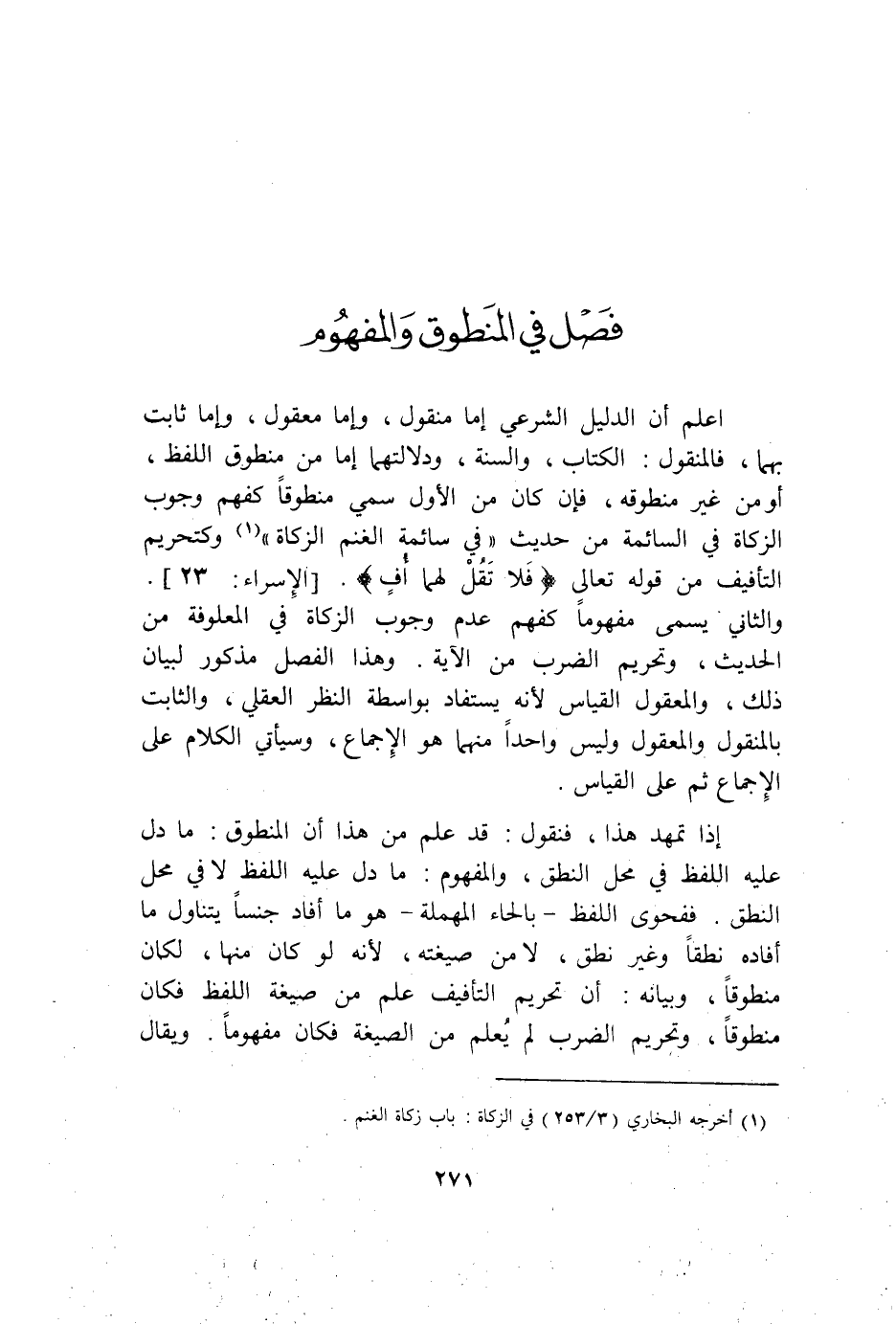 الْإِسْرَاء 23 وَالثَّانِي يُسمى مفهوما كفهم عدم وجوب الزَّكَاة فِي المعلوفة من الحَدِيث وَتَحْرِيم الضَّرْب من الْآيَة وَهَذَا الْفَصْل مَذْكُور لبَيَان ذَلِك والمعقول الْقيَاس لِأَنَّهُ يُسْتَفَاد بِوَاسِطَة النّظر الْعقلِيّ وَالثَّابِت بالمنقول والمعقول وَلَيْسَ وَاحِدًا مِنْهُمَا هُوَ الْإِجْمَاع وَسَيَأْتِي الْكَلَام على الْإِجْمَاع ثمَّ على الْقيَاس إِذا تمهد هَذَا فَنَقُول قد علم من هَذَا أَن الْمَنْطُوق مَا دلّ عَلَيْهِ اللَّفْظ فِي مَحل النُّطْق وَالْمَفْهُوم مَا دلّ عَلَيْهِ اللَّفْظ لَا فِي مَحل النُّطْق ففحوى بِاللَّفْظِ بِالْحَاء الْمُهْملَة هُوَ مَا أَفَادَ جِنْسا يتَنَاوَل مَا أَفَادَهُ نطقا وَغير نطق لَا من صيغته لِأَنَّهُ لَو كَانَ مِنْهَا لَكَانَ منطوقا وَبَيَانه أَن تَحْرِيم التأفيف علم من صِيغَة اللَّفْظ فَكَانَ منطوقا وَتَحْرِيم الضَّرْب لم يعلم من الصِّيغَة فَكَانَ مفهوما وَيُقَال