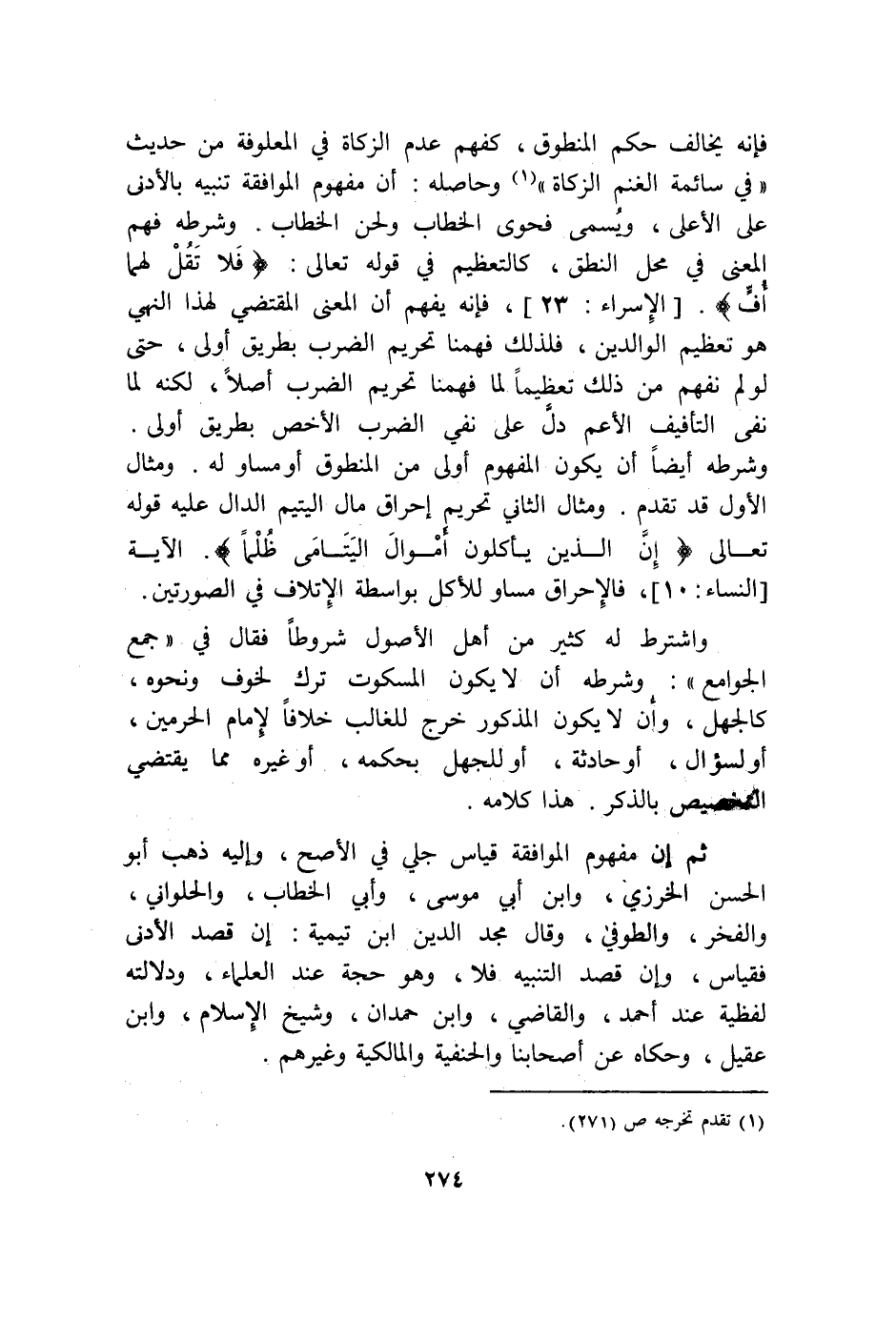 وَمِثَال الثَّانِي تَحْرِيم إحراق مَال الْيَتِيم الدَّال عَلَيْهِ قَوْله تَعَالَى {الَّذين يَأْكُلُون أَمْوَال الْيَتَامَى ظلما} النِّسَاء 10 الْآيَة فالإحراق مسَاوٍ للْأَكْل بِوَاسِطَة الْإِتْلَاف فِي الصُّورَتَيْنِ وَاشْترط لَهُ كثير من أهل الْأُصُول شُرُوطًا