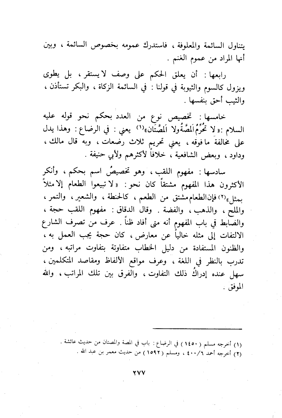 خَامِسهَا تَخْصِيص نوع من الْعدَد بِحكم نَحْو قَوْله عَلَيْهِ السَّلَام لَا تحرم المصة وَلَا المصتان يَعْنِي فِي الرَّضَاع وَهَذَا يدل على مُخَالفَة مَا فَوْقه يَعْنِي تَحْرِيم ثَلَاث رَضعَات وَبِه قَالَ مَالك وَدَاوُد وَبَعض الشَّافِعِيَّة خلافًا لأكثرهم وَلأبي حنيفَة