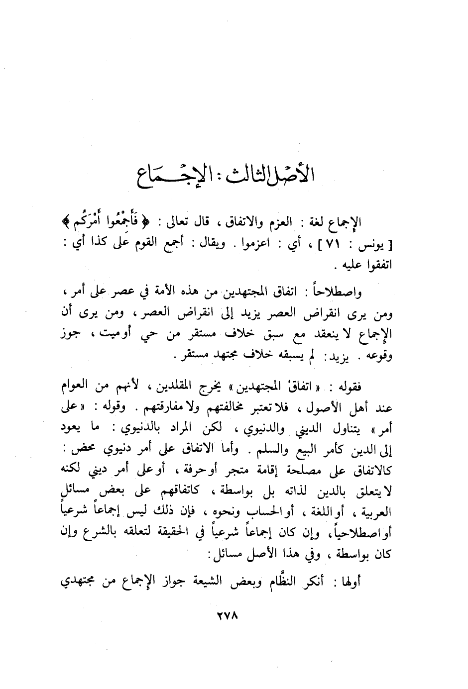 وَاصْطِلَاحا اتِّفَاق الْمُجْتَهدين من هَذِه الْأمة فِي عصر من العصور على أَمر أَمر وَمن يرى انْقِرَاض الْعَصْر يزِيد إِلَى انْقِرَاض الْعَصْر وَمن يرى أَن الْإِجْمَاع لَا ينْعَقد مَعَ سبق خلاف مُسْتَقر من حَيّ أَو ميت جوز وُقُوعه يزِيد لم يسْبقهُ خلاف مُجْتَهد مُسْتَقر فَقَوله اتِّفَاق الْمُجْتَهدين يخرج المقلدين لأَنهم من الْعَوام عِنْد أهل الْأُصُول فَلَا تعْتَبر مُخَالفَته وَلَا مُوَافَقَته وَقَوله على أَمر يتَنَاوَل الديني والدنيوي لَكِن المُرَاد بالدنيوي مَا يعود إِلَى الدّين كأمر البيع وَالسّلم وَأما الِاتِّفَاق على أَمر دُنْيَوِيّ مَحْض كالاتفاق على مصلحَة إِقَامَة متجر أَو حِرْفَة أَو على أَمر ديني لكنه لَا يتَعَلَّق بِالدّينِ لذاته بل بِوَاسِطَة كاتفاقهم على بعض مسَائِل الْعَرَبيَّة أَو اللُّغَة أَو الْحساب وَنَحْوه فَإِن ذَلِك لَيْسَ إِجْمَاعًا شَرْعِيًّا أَو اصطلاحيا وَإِن كَانَ إِجْمَاعًا شَرْعِيًّا فِي الْحَقِيقَة لتَعَلُّقه بِالشَّرْعِ وَإِن كَانَ بِوَاسِطَة وَفِي هَذَا الأَصْل مسَائِل أَولهَا أنكر النظام وَبَعض الشِّيعَة جَوَاز الْإِجْمَاع من مجتهدي