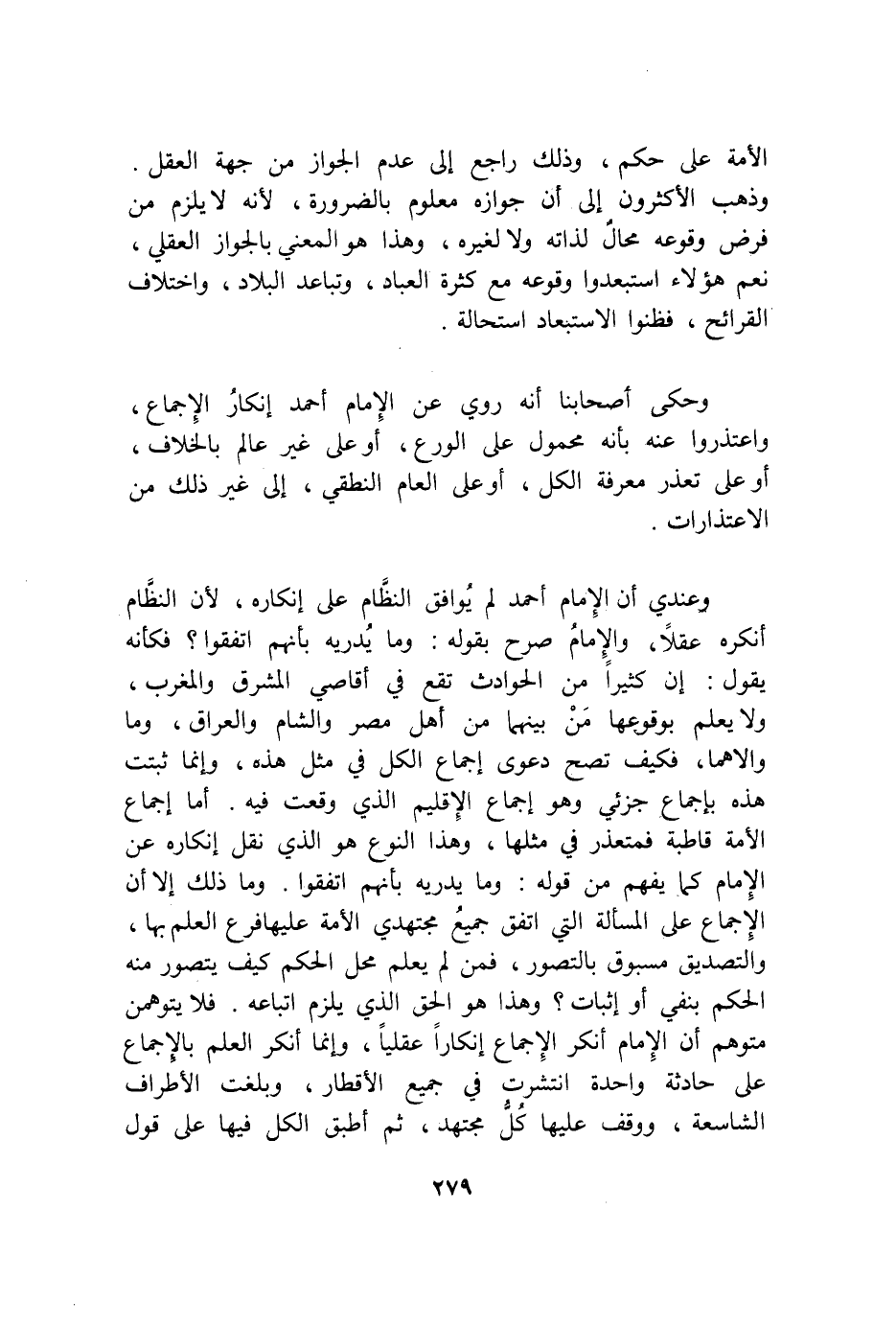 نعم هَؤُلَاءِ استبعدوا وُقُوعه مَعَ كَثْرَة الْعباد وتباعد الْبِلَاد وَاخْتِلَاف القرائح فظنوا الاستبعاد اسْتِحَالَة وَحكى أَصْحَابنَا أَنه رُوِيَ عَن الإِمَام أَحْمد إِنْكَار الْإِجْمَاع وَاعْتَذَرُوا عَنهُ بِأَنَّهُ مَحْمُول على الْوَرع أَو على غير عَالم بِالْخِلَافِ أَو على تعذر معرفَة الْكل أَو على الْعَام النطقي إِلَى غير ذَلِك من الاعتذارات وَعِنْدِي أَن الإِمَام أَحْمد لم يُوَافق النظام على إِنْكَاره لِأَن النظام أنكرهُ عقلا ولإمام صرح بقوله وَمَا يدريه بِأَنَّهُم اتَّفقُوا فَكَأَنَّهُ يَقُول إِن كثيرا من الْحَوَادِث تقع فِي أقاصي الْمشرق وَالْمغْرب وَلَا يعلم بوقوعها من بَينهمَا من أهل مصر وَالشَّام وَالْعراق وَمَا والاهما فَكيف تصح دَعْوَى إِجْمَاع الْكل فِي مثل هَذِه وَإِنَّمَا ثبتَتْ هَذِه بِإِجْمَاع جزئي وَهُوَ إِجْمَاع الإقليم الَّذِي وَقعت فِيهِ أما إِجْمَاع الْأمة قاطبة فمتعذر فِي مثلهَا وَهَذَا النَّوْع هُوَ الَّذِي نقل إِنْكَاره عَن الإِمَام كَمَا يفهم من قَوْله وَمَا يدريه بِأَنَّهُم أتفقوا وَمَا ذَلِك إِلَّا أَن الْإِجْمَاع على الْمَسْأَلَة الَّتِي اتّفق جَمِيع مجتهدي الْأمة عَلَيْهَا فرع الْعلم بهَا والتصديق مَسْبُوق بالتصور فَمن لم يعلم مَحل الحكم كَيفَ يتَصَوَّر مِنْهُ الحكم بِنَفْي أَو إِثْبَات وَهَذَا هُوَ الْحق الَّذِي يلْزم اتِّبَاعه فَلَا يتوهمن متوهم أَن الإِمَام أنكر الْإِجْمَاع إنكارا عقليا وَإِنَّمَا أنكر الْعلم بِالْإِجْمَاع على حَادِثَة وَاحِدَة انتشرت فِي جَمِيع الأقطار وَبَلغت الْأَطْرَاف الشاسعة ووقف عَلَيْهَا كل مُجْتَهد ثمَّ أطبق الْكل فِيهَا على قَول