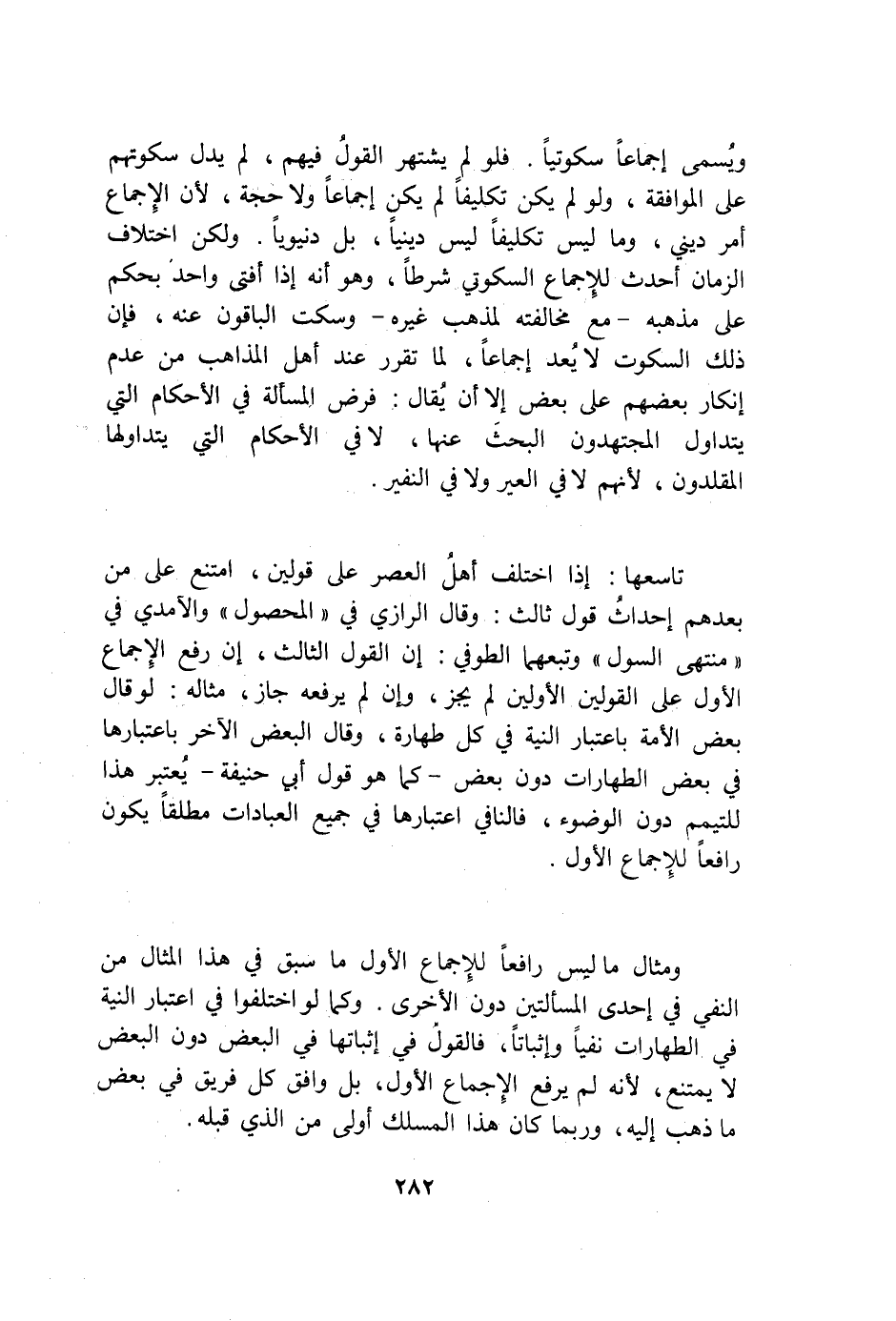 وَمِثَال مَا لَيْسَ رَافعا للْإِجْمَاع الأول مَا سبق فِي هَذَا الْمِثَال من النَّفْي فِي إِحْدَى الْمَسْأَلَتَيْنِ دون الْأُخْرَى وكما لَو اخْتلفُوا فِي اعْتِبَار النِّيَّة فِي الطهارات نفيا وإثباتا فَالْقَوْل فِي إِثْبَاتهَا فِي الْبَعْض دون الْبَعْض لَا يمْتَنع لِأَنَّهُ لم يرفع الْإِجْمَاع الأول بل وَافق كل فريق فِي بعض مَا ذهب إِلَيْهِ وَرُبمَا كَانَ هَذَا المسلك أولى من الَّذِي قبله
