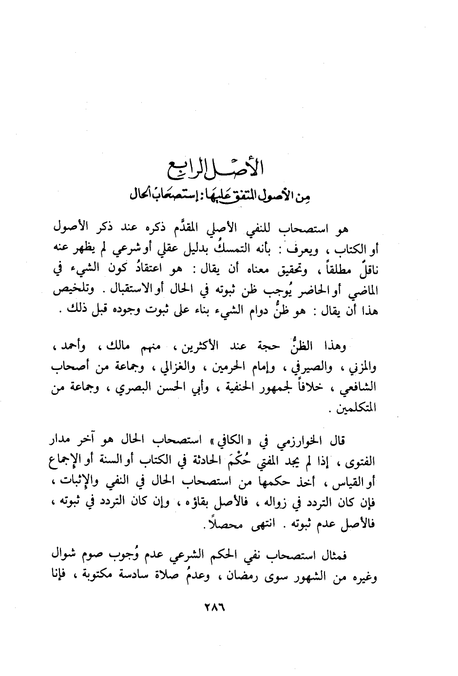الأَصْل الرَّابِع من الْأُصُول الْمُتَّفق عَلَيْهَا اسْتِصْحَاب الْحَال