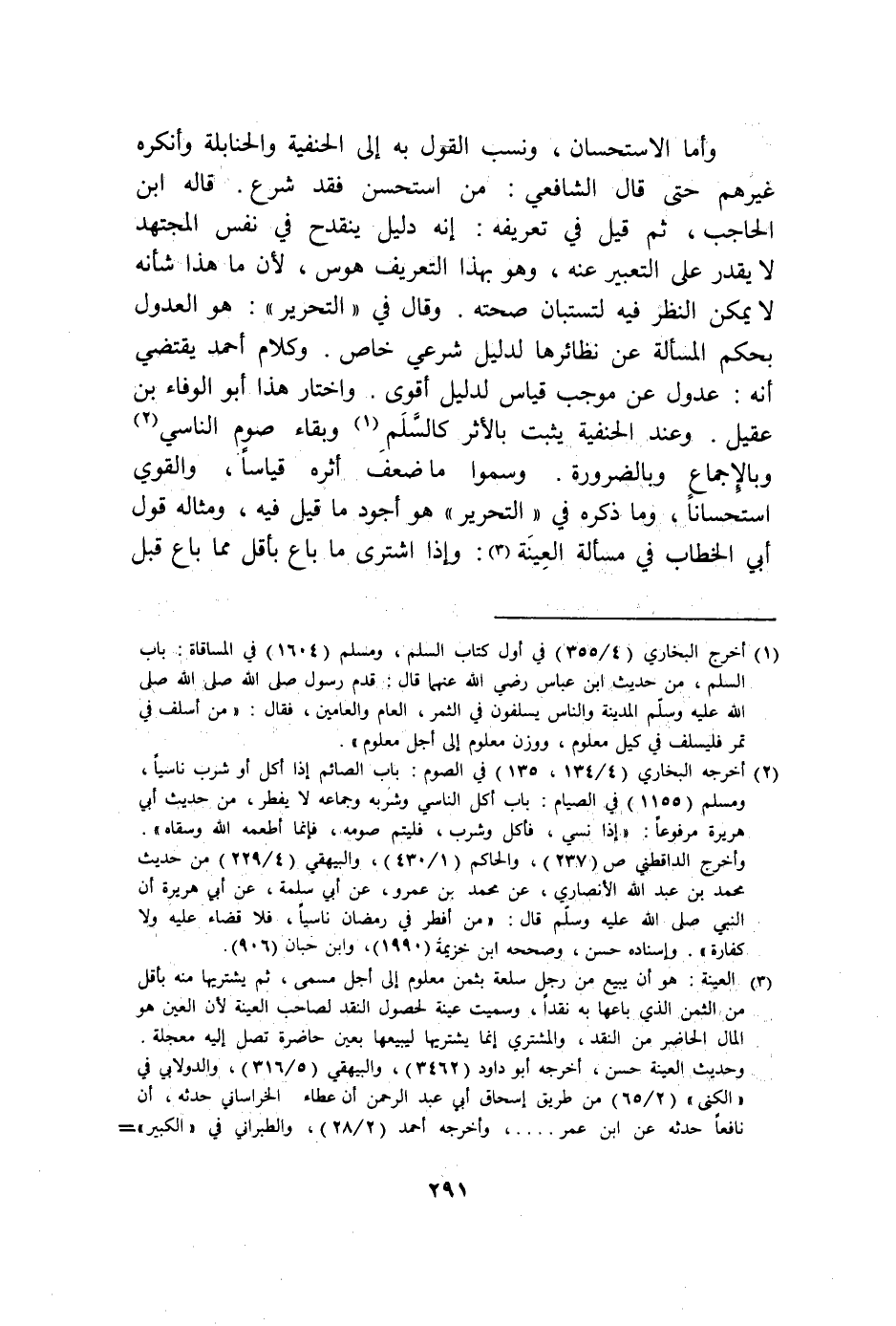 وَقَالَ فِي التَّحْرِير هُوَ الْعُدُول بِحكم الْمَسْأَلَة عَن نظائرها لدَلِيل شَرْعِي خَاص وَكَلَام أَحْمد يَقْتَضِي أَنه عدُول عَن مُوجب قِيَاس لدَلِيل أقوى وَاخْتَارَ هَذَا أَبُو الْوَفَاء بن عقيل وَعند الْحَنَفِيَّة يثبت بالأثر كسلم وَبَقَاء صَوْم النَّاسِي وبالإجماع وبالضرورة وَسموا مَا ضعف أَثَره قِيَاسا وَالْقَوِي اسْتِحْسَانًا وَمَا ذكره فِي التَّحْرِير هُوَ أَجود مَا قيل فِيهِ ومثاله قَول أبي الْخطاب فِي مَسْأَلَة الْعينَة وَإِذا اشْترى مَا بَاعَ بِأَقَلّ مِمَّا بَاعَ قبل