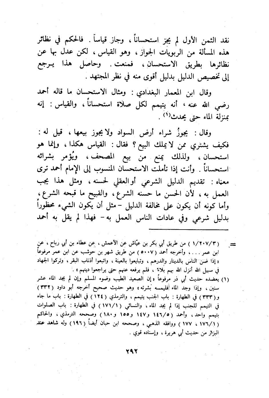 وَقَالَ يجوز شِرَاء أَرض السوَاد وَلَا يجوز بيعهَا قيل لَهُ فَكيف يشترى مِمَّن لَا يملك البيع فَقَالَ الْقيَاس هَكَذَا وَإِنَّمَا هُوَ اسْتِحْسَان وَلذَلِك يمْنَع من بيع الْمُصحف وَيُؤمر بِشِرَائِهِ اسْتِحْسَانًا وَأَنت إِذا تَأَمَّلت الِاسْتِحْسَان الْمَنْسُوب إِلَى الإِمَام أَحْمد ترى مَعْنَاهُ تَقْدِيم الدَّلِيل الشَّرْعِيّ أَو الْعقلِيّ لحسنه وَمثل هَذَا يجب الْعَمَل بِهِ لِأَن الْحسن مَا حسنه الشَّرْع والقبيح مَا قبحه الشَّرْع وَمَا كَونه أَن يكون على مُخَالفَة الدَّلِيل مثل أَن يكون الشَّيْء مَحْظُورًا بِدَلِيل شَرْعِي وَفِي عادات النَّاس الْعَمَل بِهِ فَهَذَا لم يقل بِهِ أَحْمد