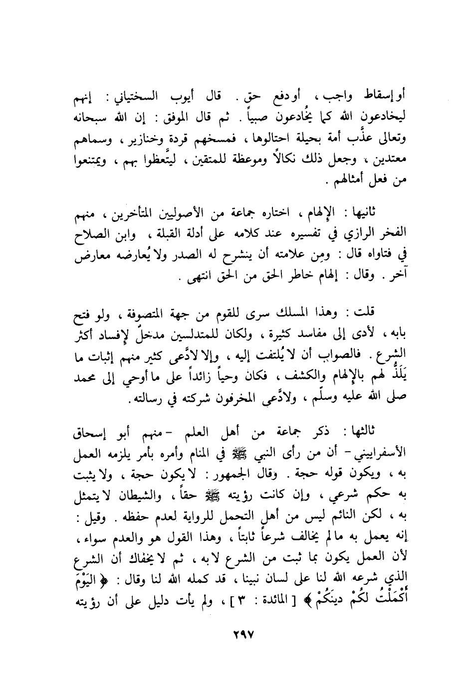 قلت وَهَذَا المسلك سري للْقَوْم من جِهَة المتصوفة وَلَو فتح بَابه لَأَدَّى إِلَى مفاسد كَثِيرَة ولكان للمتدلسين مدْخل لإفساد أَكثر الشَّرْع فَالصَّوَاب أَن لَا يلْتَفت إِلَيْهِ والإ لادعى كثير مِنْهُم إِثْبَات مَا يلذ لَهُم بالإلهام والكشف فَكَانَ وَحيا زَائِدا على مَا أُوحِي إِلَى مُحَمَّد صلى الله عَلَيْهِ وَسلم ولادعى المخرقون شركته فِي رسَالَته