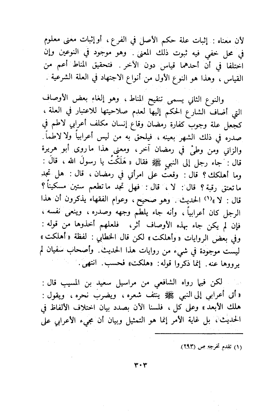 لِأَن مَعْنَاهُ إِثْبَات عِلّة حكم الأَصْل فِي الْفَرْع أَو إِثْبَات معنى مَعْلُوم فِي مَحل خَفِي فِيهِ ثُبُوت ذَلِك الْمَعْنى وَهُوَ مَوْجُود فِي النَّوْعَيْنِ وَإِن اخْتلفَا فِي أَن أَحدهمَا قِيَاس دون الآخر فتحقيق المناط أَعم من الْقيَاس وَهَذَا هُوَ النَّوْع الأول من أَنْوَاع الِاجْتِهَاد فِي الْعلَّة الشَّرْعِيَّة وَالنَّوْع الثَّانِي يُسمى تَنْقِيح المناط وَهُوَ إِلْغَاء بعض الْأَوْصَاف الَّتِي أضَاف الشَّارِع الحكم إِلَيْهَا لعدم صلاحيتها للاعتبار فِي الْعلَّة كجعل عِلّة وجوب كَفَّارَة رَمَضَان وقاع إِنْسَان مُكَلّف أَعْرَابِي لاطم فِي صَدره فِي ذَلِك الشَّهْر بِعَيْنِه فَيلْحق بِهِ من لَيْسَ أَعْرَابِيًا وَلَا لاطما وَالزَّانِي وَمن وطىء فِي رَمَضَان آخر وَمعنى هَذَا مَا روى أَبُو هُرَيْرَة قَالَ جَاءَ رجل إِلَى النَّبِي صلى الله عَلَيْهِ وَسلم فَقَالَ هَلَكت يَا رَسُول الله