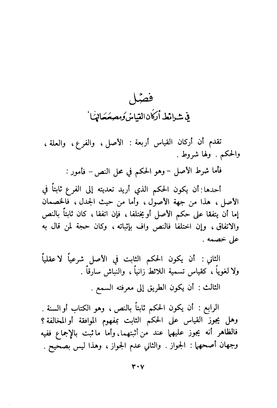 فصل فِي شَرَائِط أَرْكَان الْقيَاس ومصححاتها