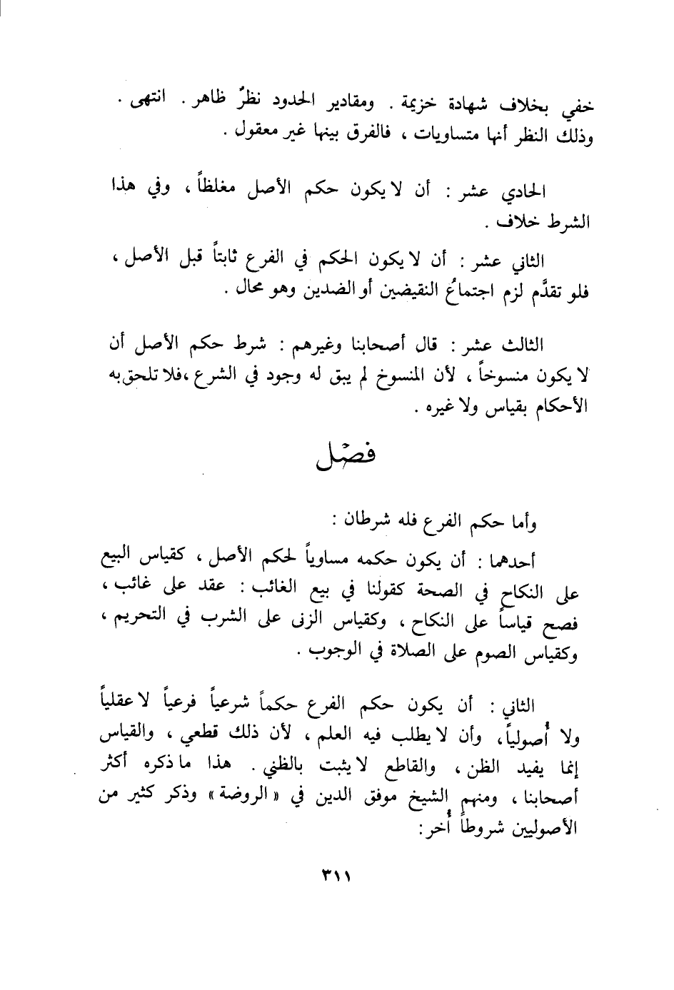 الثَّالِث عشر قَالَ أَصْحَابنَا وَغَيرهم شَرط حكم الأَصْل أَن لَا يكون مَنْسُوخا لِأَن الْمَنْسُوخ لم يبْق لَهُ وجود فِي الشَّرْع فتلحق بِهِ الْأَحْكَام بِقِيَاس وَلَا غَيره