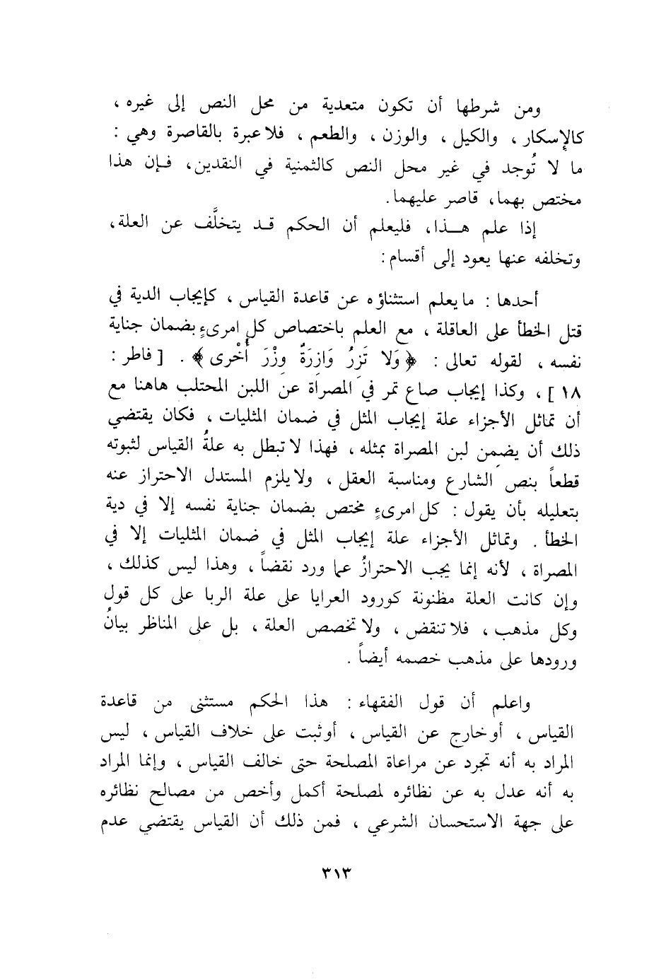 وَمن شَرطهَا أَن تكون متعدية من مَحل النَّص إِلَى غَيره كالإسكار والكيل وَالْوَزْن والطعم فَلَا عِبْرَة بالقاصرة وَهِي مَا لَا تُوجد فِي غير مَحل النَّص كالثمينة فِي النَّقْدَيْنِ فَإِن هَذَا مُخْتَصّ بهما قَاصِر عَلَيْهِمَا إِذا علم هَذَا فَليعلم أَن الحكم قد يتَخَلَّف عَن الْعلَّة وتخلفه عَنْهُمَا يعود إِلَى أَقسَام أَحدهَا مَا يعلم اسْتِثْنَاؤُهُ عَن قَاعِدَة الْقيَاس كإيجاب الدِّيَة فِي قتل الْخَطَأ على الْعَاقِلَة مَعَ الْعلم باختصاص كل امرىء بِضَمَان جِنَايَة نَفسه لقَوْله تَعَالَى {وَلا تَزِرُ وَازِرَةٌ وِزْرَ أُخْرَى} الْأَنْعَام 164 وَكَذَا إِيجَاب صَاع تمر فِي الْمُصراة عَن اللَّبن المحتلب هَهُنَا مَعَ أَن تماثل الْأَجْزَاء عِلّة إِيجَاب الْمثل فِي ضَمَان الْمِثْلِيَّات فَكَانَ يَقْتَضِي ذَلِك أَن يضمن لبن الْمُصراة بِمثلِهِ فَهَذَا لَا تبطل بِهِ عِلّة الْقيَاس لثُبُوته قطعا بِنَصّ الشَّارِع ومناسبة الْعقل وَلَا يلْزم المستبدل الِاحْتِرَاز عَنهُ بتعليله بِأَن يَقُول كل امرىء مُخْتَصّ بِضَمَان جِنَايَة نَفسه إِلَّا فِي دِيَة الْخَطَأ وتماثل الْأَجْزَاء عِلّة إِيجَاب الْمثل فِي ضَمَان الْمِثْلِيَّات إِلَّا فِي المصرات لِأَنَّهُ إِنَّمَا يجب الِاحْتِرَاز عَمَّا ورد نقضا وَهَذَا لَيْسَ كَذَلِك وَإِن كَانَت الْعلَّة مظنونة كورود الْعَرَايَا على عِلّة الرِّبَا على كل قَول وكل مَذْهَب بِلَا نقض وَلَا تَخْصِيص الْعلَّة بل على المناظر بَيَان وُرُودهَا على مَذْهَب خَصمه أَيْضا