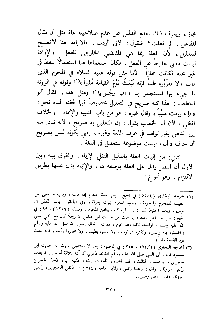 فالإرادة هُنَا لَا تصلح للتَّعْلِيل لِأَن الْعلَّة إِنَّمَا هِيَ الْمُقْتَضى الْخَارِجِي للْفِعْل والإرادة لَيست معنى خَارِجا عَن الْفِعْل فَكَانَ اسْتِعْمَالهَا هُنَا اسْتِعْمَالا للفظ فِي غير مَحَله فَكَانَت مجَازًا فإمَّا مثل قَوْله عَلَيْهِ السَّلَام فِي الْمحرم الَّذِي مَاتَ لَا تقربوه طيبا فَإِنَّهُ يبْعَث يَوْم الْقِيَامَة ملبيا وَقَوله فِي الروثة لما جِيءَ بهَا ليستجمر بهَا أَنَّهَا رِجْس