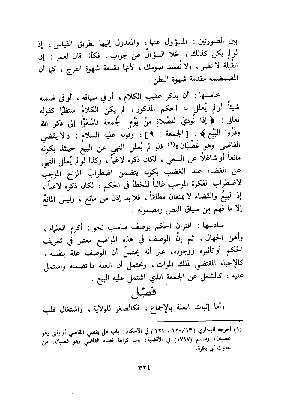 خَامِسهَا أَن يذكر عقيب الْكَلَام أَو فِي سِيَاقه أَو فِي ضمنه شَيْئا لَو لم يُعلل بِهِ الحكم الْمَذْكُور لم يكن الْكَلَام منتظما كَقَوْلِه تَعَالَى {إِذَا نُودِيَ لِلصَّلاةِ مِنْ يَوْمِ الْجُمُعَةِ فَاسَعَوْا إِلَى ذكر الله وذروا الْبَيْعَ} الْجُمُعَة 9 {وَقَوله عَلَيْهِ السَّلَام لَا يقْضِي القَاضِي وَهُوَ غَضْبَان فَلَو لم يُعلل النَّهْي عَن البيع حِينَئِذٍ بِكَوْنِهِ مَانِعا أَو شاغلا عَن السَّعْي لَكَانَ ذكره لاغيا وَكَذَا لَو لم يُعلل النَّهْي عَن الْقَضَاء عِنْد الْغَضَب بِكَوْنِهِ يتَضَمَّن اضْطِرَاب المزاج الْمُوجب لاضطراب الفكرة الْمُوجب غَالِبا للخطأ فِي الحكم لَكَانَ ذكره لاغيا إِذْ البيع وَالْقَضَاء لَا يمنعان مُطلقًا فَلَا بُد إِذن من مَانع وَلَيْسَ الْمَانِع إِلَّا مَا فهم من سِيَاق النَّص ومضمونه