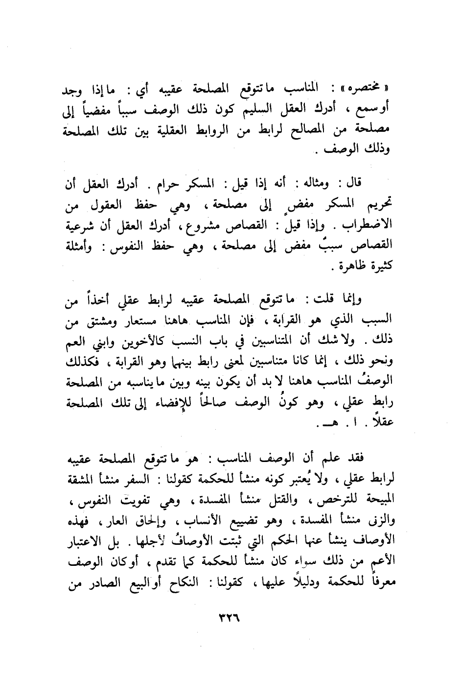 وَإِذا قيل الْقصاص مَشْرُوع أدْرك الْعقل أَن شَرْعِيَّة الْقصاص سَبَب مفض إِلَى مصلحَة وَهِي حفظ النُّفُوس وأمثلة كَثِيرَة ظَاهِرَة وَإِنَّمَا قلت مَا تتَوَقَّع الْمصلحَة عَقِيبه لرابط عَقْلِي أخذا من السَّبَب الَّذِي هُوَ الْقَرَابَة فَإِن الْمُنَاسب هَهُنَا مستعار ومشتق من ذَلِك وَلَا شكّ أَن المتناسبين فِي بَاب النّسَب كالأخوين وَابْني الْعم وَنَحْو ذَلِك إِنَّمَا كَانَا متناسبين لِمَعْنى رابط بَينهمَا وَهُوَ الْقَرَابَة فَكَذَلِك الْوَصْف الْمُنَاسب هَهُنَا لَا بُد وَأَن يكون بَينه وَبَين مَا يُنَاسِبه من الْمصلحَة رابط عَقْلِي وَهُوَ كَون الْوَصْف صَالحا للإفضاء إِلَى تِلْكَ الْمصلحَة عقلا اه