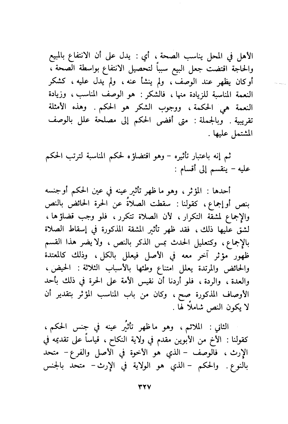 ثمَّ إِنَّه بِاعْتِبَار تَأْثِيره وَهُوَ اقتضاؤه لحكم الْمُنَاسبَة لترتب الحكم عَلَيْهِ يَنْقَسِم إِلَى أَقسَام أَحدهَا الْمُؤثر وَهُوَ مَا ظهر تَأْثِير عينه فِي عين الحكم أَو جنسه بِنَصّ أَو إِجْمَاع كَقَوْلِنَا سَقَطت الصَّلَاة عَن الْحرَّة الْحَائِض بِالنَّصِّ وَالْإِجْمَاع لمَشَقَّة التّكْرَار لِأَن الصَّلَاة تَتَكَرَّر فَلَو وَجب قَضَاؤُهَا لشق عَلَيْهَا ذَلِك فقد ظهر تأثر الْمَشَقَّة الْمَذْكُورَة فِي إِسْقَاط الصَّلَاة بِالْإِجْمَاع وكتعليل الْحَدث بِمَسّ الذّكر بِالنَّصِّ وَلَا يضر هَذَا الْقسم ظُهُور مُؤثر آخر مَعَه فِي الأَصْل فيعلل بِالْكُلِّ وَذَلِكَ كالمعتدة وَالْحَائِض والمرتدة يُعلل امْتنَاع وَطئهَا بالأسباب الثَّلَاثَة الْحيض وَالْعدة وَالرِّدَّة