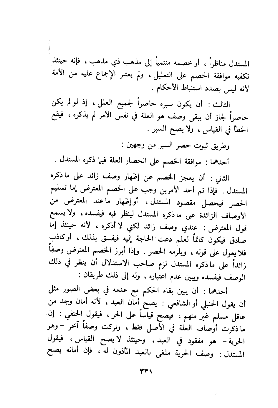 الثَّالِث أَن يكون سبره حاصرا لجَمِيع الْعِلَل إِذْ لَو لم يكن حاصرا لجَاز أَن يبْقى وصف هُوَ الْعلَّة فِي نفس الْأَمر لم يذكرهُ فَيَقَع الْخَطَأ فِي الْقيَاس وَلَا يَصح السبر
