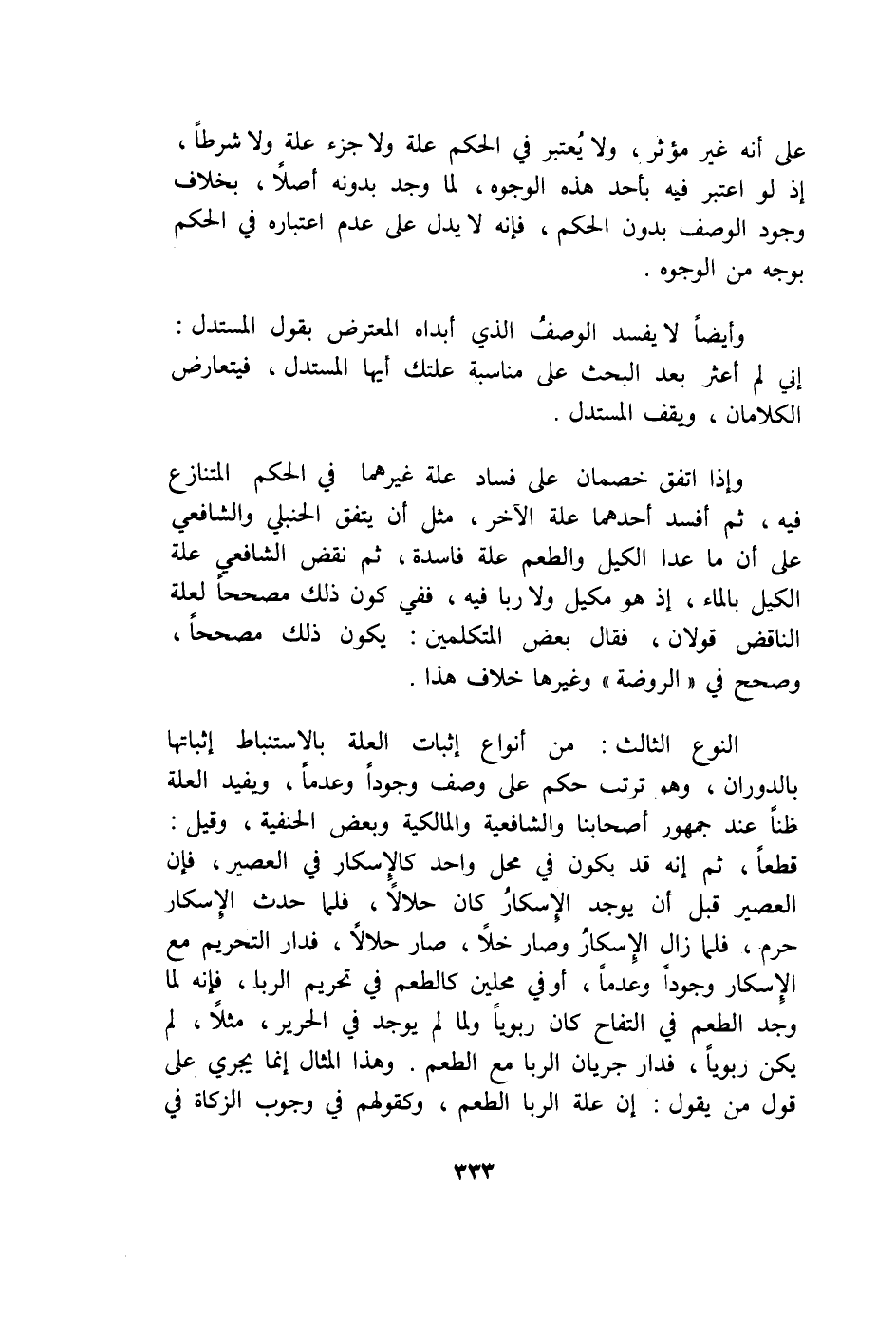 النَّوْع الثَّالِث من أَنْوَاع إِثْبَات الْعلَّة بالاستنباط إِثْبَاتهَا بالدوران وَهُوَ ترَتّب حكم على وصف وجودا وعدما ويفيد الْعلَّة ظنا عِنْد جُمْهُور أَصْحَابنَا وَالشَّافِعِيَّة والمالكية وَبَعض الْحَنَفِيَّة وَقيل قطعا ثمَّ إِنَّه قد يكون فِي مَحل وَاحِد كالإسكار فِي الْعصير فَإِن الْعصير قبل أَن يُوجد الْإِسْكَار كَانَ حَلَالا فَلَمَّا حدث الْإِسْكَار حرم فَلَمَّا زَالَ الْإِسْكَار وَصَارَ خلا صَار حَلَالا فدار التَّحْرِيم مَعَ الْإِسْكَار وجودا وعدما وَأما فِي محلين كالطعم فِي تَحْرِيم الرِّبَا فَإِنَّهُ لما وجد الطّعْم فِي التفاح كَانَ ربويا وَلما لم يُوجد فِي الْحَرِير مثلا لم يكن ربويا فدار جَرَيَان الرِّبَا مَعَ الطّعْم