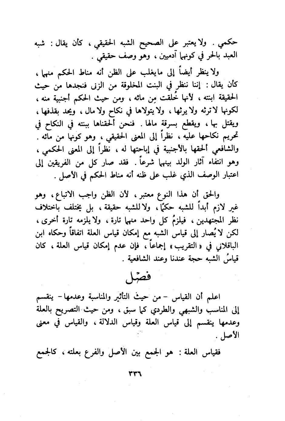 حكمي وَلَا يعْتَبر على الصَّحِيح الشّبَه الْحَقِيقِيّ كَأَن يُقَال شبه العَبْد بالحرفي كَونهمَا آدميين وَهُوَ وصف حَقِيقِيّ وَلَا ينظر أَيْضا إِلَى مَا يغلب على الظَّن أَنه منَاط الحكم مِنْهُمَا كَأَن يُقَال إننا نَنْظُر فِي الْبِنْت المخلوقة من الزِّنَا فنجدها من حَيْثُ الْحَقِيقَة ابْنَته لِأَنَّهَا خلقت من مَائه وَمن حَيْثُ الحكم أَجْنَبِيَّة مِنْهُ لكَونهَا لَا تَرثه وَلَا يَرِثهَا وَلَا يتولاها فِي نِكَاح وَلَا مَال وَيحد بقذفها وَيقتل بهَا وَيقطع بِسَرِقَة مَالهَا