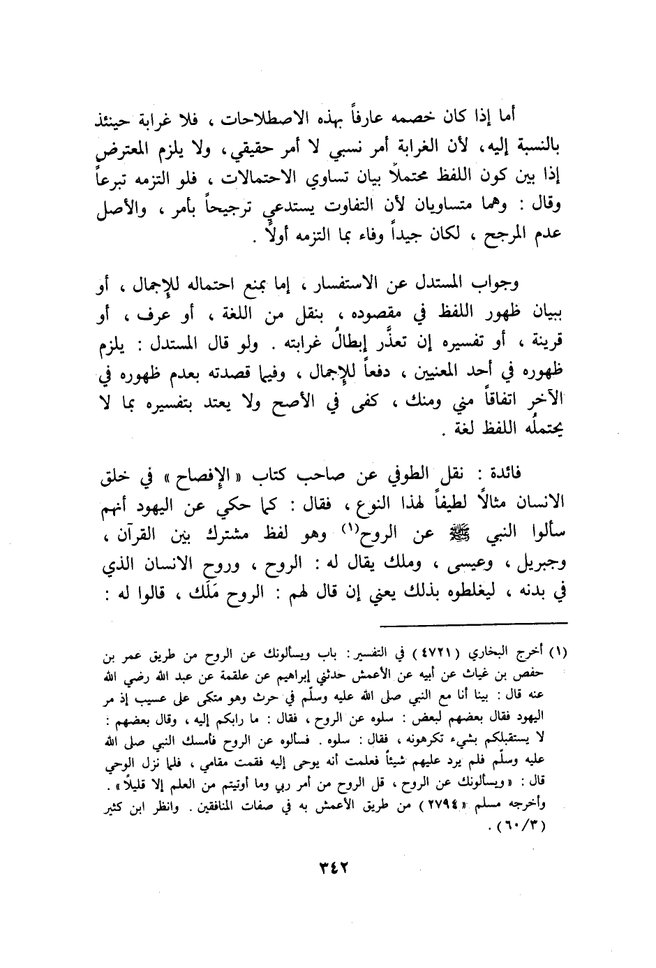 فَائِدَة نقل الطوفي عَن صَاحب كتاب الإفصاح فِي خلق الْإِنْسَان مِثَالا لطيفا لهَذَا النَّوْع فَقَالَ كَمَا حكى عَن الْيَهُود أَنهم سَأَلُوا النَّبِي صلى الله عَلَيْهِ وَسلم عَن الرّوح وَهُوَ لفظ مُشْتَرك بَين الْقُرْآن وَجِبْرِيل وَعِيسَى وَملك يُقَال لَهُ الرّوح وروح الْإِنْسَان الَّذِي فِي بدنه ليغلطوه بذلك يَعْنِي إِن قَالَ لَهُم الرّوح ملك قَالُوا لَهُ