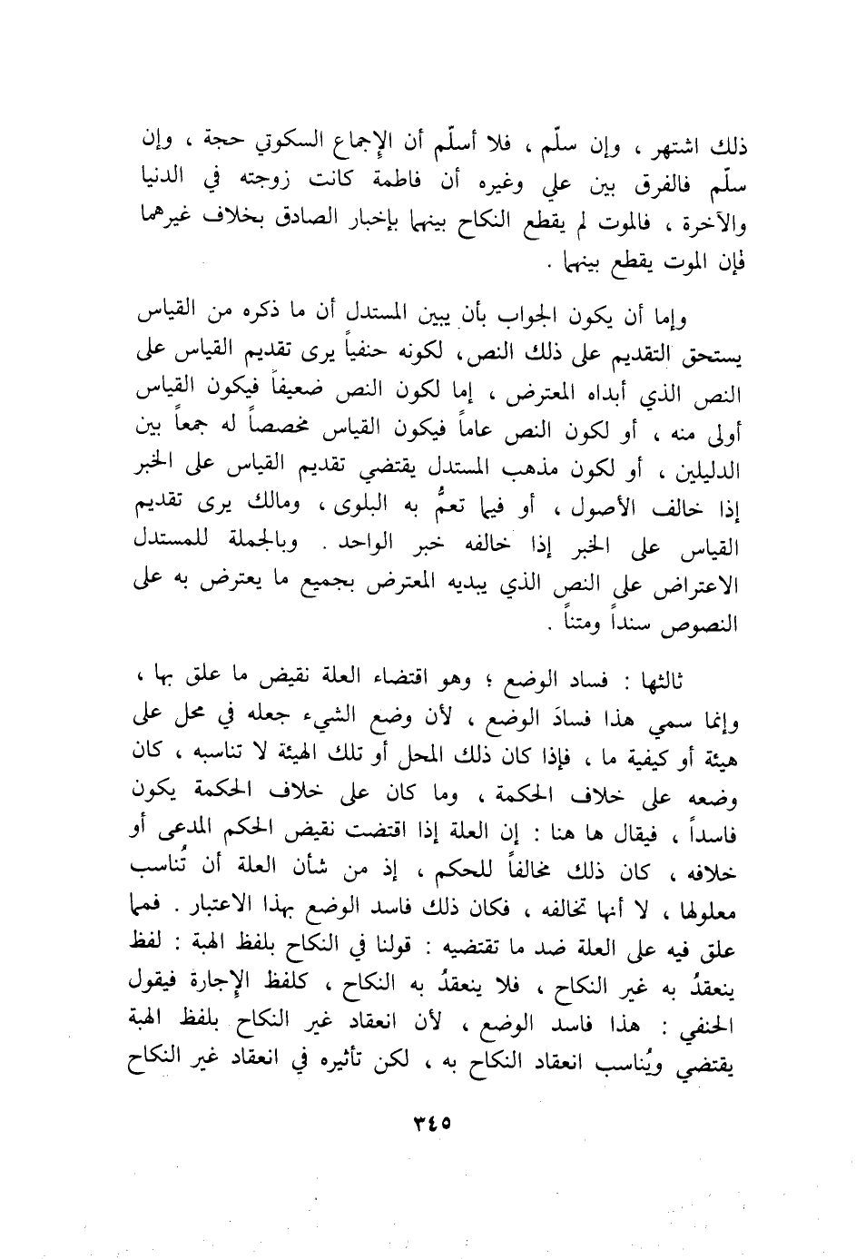 ومالكا يرى تَقْدِيم الْقيَاس على الْخَبَر إِذا خَالفه خبر الْوَاحِد وَبِالْجُمْلَةِ للمستدل الِاعْتِرَاض على النَّص الَّذِي يبديه الْمُعْتَرض بِجَمِيعِ مَا يعْتَرض بِهِ على النُّصُوص سندا ومتنا