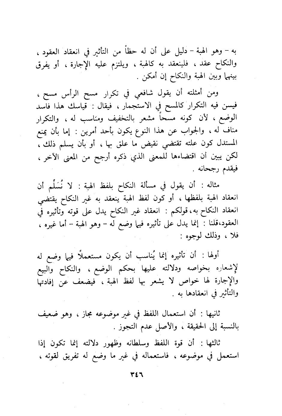 بِهِ وَهُوَ الْهِبَة دَلِيل على أَن لَهُ حظا من التَّأْثِير فِي انْعِقَاد الْعُقُود وَالنِّكَاح عقد فلينعقد بِهِ كَالْهِبَةِ ويلتزم عَلَيْهِ الْإِجَارَة أَو يفرق بَينهمَا وَبَين الْهِبَة وَالنِّكَاح إِن أمكن وَمن أمثلته أَن يَقُول شَافِعِيّ فِي تكْرَار مسح الرَّأْس مسح فَيسنّ فِيهِ التّكْرَار كالمسح فِي الِاسْتِجْمَار فَيُقَال قياسك هَذَا فَاسد الْوَضع لِأَن كَونه مسحا مشْعر بِالتَّخْفِيفِ ومناسب لَهُ والتكرار منَاف لَهُ