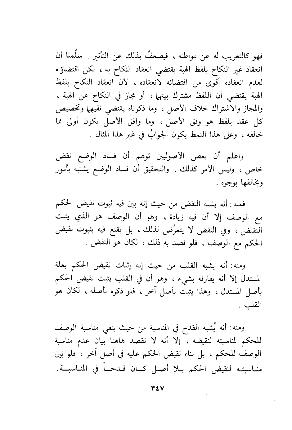 وَاعْلَم أَن بعض الْأُصُولِيِّينَ توهم أَن فَسَاد الْوَضع نقض خَاص وَلَيْسَ الْأَمر كَذَلِك وَالتَّحْقِيق أَن فَسَاد الْوَضع يشْتَبه بِأُمُور ويخالفها بِوُجُوه فَمِنْهُ أَنه يشبه النَّقْض من حَيْثُ إِنَّه بَين فِيهِ ثُبُوت نقيض الحكم مَعَ الْوَصْف إِلَّا أَن فِيهِ زِيَادَة وَهُوَ أَن الْوَصْف هُوَ الَّذِي يثبت النقيض وَفِي النَّقْض لَا يتَعَرَّض لذَلِك بل يقنع فِيهِ بِثُبُوت نقيض الحكم مَعَ الْوَصْف فَلَو قصد بِهِ ذَلِك لَكَانَ هُوَ النَّقْض وَمِنْه أَنه يشبه الْقلب من حَيْثُ إِنَّه إِثْبَات نقيض الحكم بعلة الْمُسْتَدلّ إِلَّا أَنه يُفَارِقهُ بِشَيْء وَهُوَ أَن فِي الْقلب يثبت نقيض الحكم بِأَصْل الْمُسْتَدلّ وَهَذَا يثبت بِأَصْل آخر فَلَو ذكره بِأَصْلِهِ لَكَانَ هُوَ الْقلب