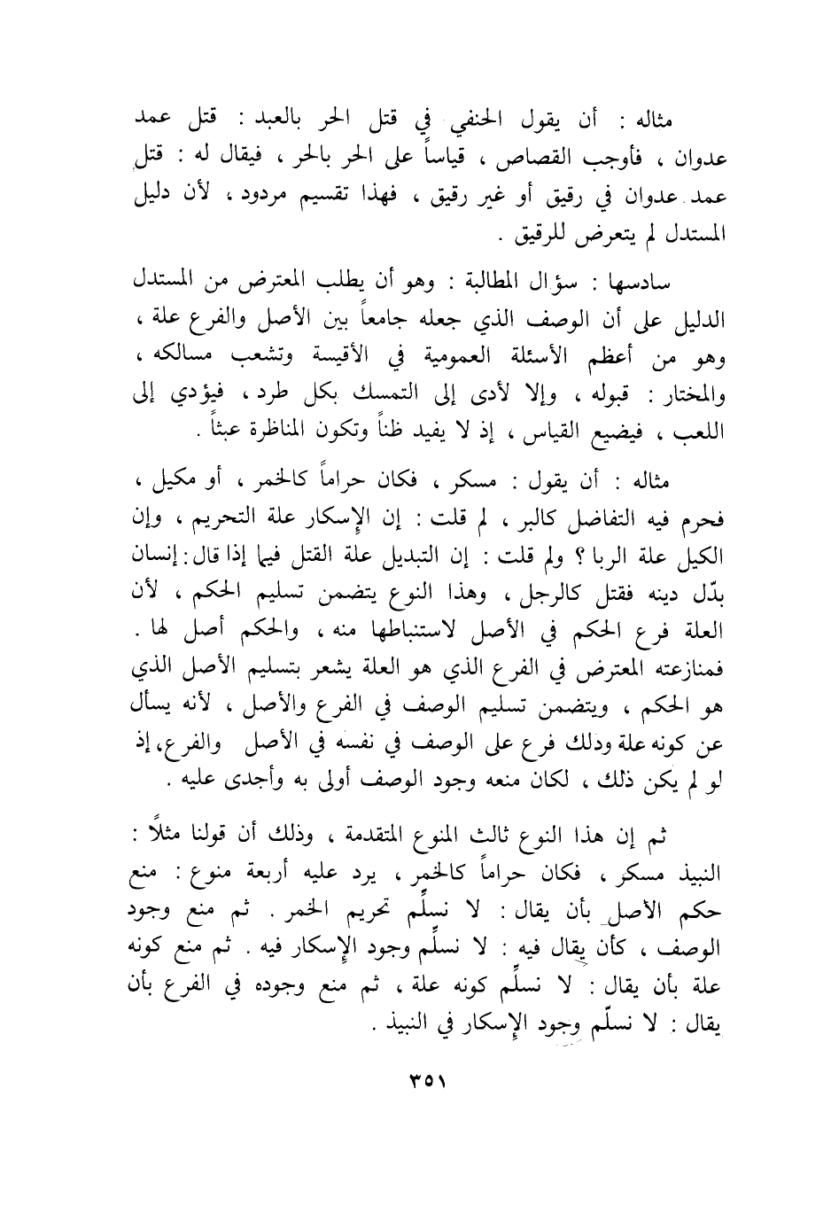مِثَاله أَن يَقُول مُسكر فَكَانَ حَرَامًا كَالْخمرِ أَو مَكِيل فَحرم فِيهِ التَّفَاضُل كالبر لم قلت إِن الْإِسْكَار عِلّة التَّحْرِيم وَإِن الْكَيْل عِلّة الرِّبَا وَلم قلت إِن التبديل عِلّة الْقَتْل فِيمَا إِذا قَالَ إِنْسَان بدل دينه فَقتل كَالرّجلِ وَهَذَا النَّوْع يتَضَمَّن تَسْلِيم الحكم لِأَن الْعلَّة فرع الحكم فِي الأَصْل لاستنباطها مِنْهُ وَالْحكم أصل لَهَا فمنازعته الْمُعْتَرض فِي الْفَرْع الَّذِي هُوَ الْعلَّة يشْعر بِتَسْلِيم الأَصْل الَّذِي هُوَ الحكم ويتضمن تَسْلِيم الْوَصْف فِي الْفَرْع وَالْأَصْل لِأَنَّهُ يسْأَل عَن كَونه عِلّة وَذَلِكَ فرع على الْوَصْف فِي نَفسه فِي الأَصْل وَالْفرع إِذْ لَو لم يكن ذَلِك لَكَانَ مَنعه وجود الْوَصْف أولى بِهِ وأجدى عَلَيْهِ