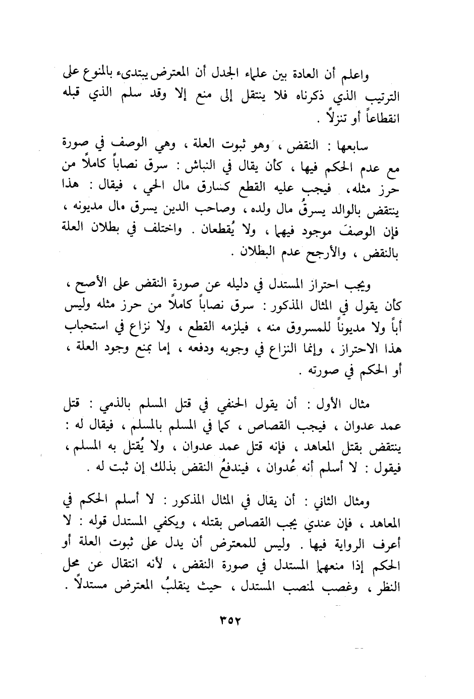 سابعها النَّقْض وَهُوَ ثُبُوت الْعلَّة وَهِي الْوَصْف فِي صُورَة مَعَ عدم الحكم فِيهَا كَأَن يُقَال فِي النباش سرق نِصَابا كَامِلا من حرز مثله فَيجب عَلَيْهِ الْقطع كسارق مَال الْحَيّ فَيُقَال هَذَا ينْتَقض بالوالد يسرق مَال وَالِده وَصَاحب الدّين يسرق مَال مديونه فَإِن الْوَصْف مَوْجُود فيهمَا وَلَا يقْطَعَانِ وَاخْتلف فِي بطلَان الْعلَّة بِالنَّقْضِ والأرجح عدم الْبطلَان وَيجب احْتِرَاز الْمُسْتَدلّ فِي دَلِيله عَن صُورَة النَّقْض على الْأَصَح كَأَن يَقُول فِي الْمِثَال الْمَذْكُور سرق نِصَابا كَامِلا من حرز مثله وَلَيْسَ أَبَا وَلَا مديونا للمسروق مِنْهُ فَيلْزمهُ الْقطع وَلَا نزاع فِي اسْتِحْبَاب هَذَا الِاحْتِرَاز وَإِنَّمَا النزاع فِي وُجُوبه وَدفعه إِمَّا بِمَنْع وجود الْعلَّة أَو الحكم فِي صورته مِثَال الأول أَن يَقُول الْحَنَفِيّ فِي قتل الْمُسلم بالذمي قتل عمد عدوان فَيجب الْقصاص كَمَا فِي الْمُسلم بِالْمُسلمِ فَيُقَال لَهُ ينْتَقض بقتل الْمعَاهد فَإِنَّهُ قتل عمد عدوان وَلَا يقتل بِهِ الْمُسلم فَيَقُول لَا أسلم أَنه عدوان فيندفع النقيض بذلك إِن ثَبت لَهُ