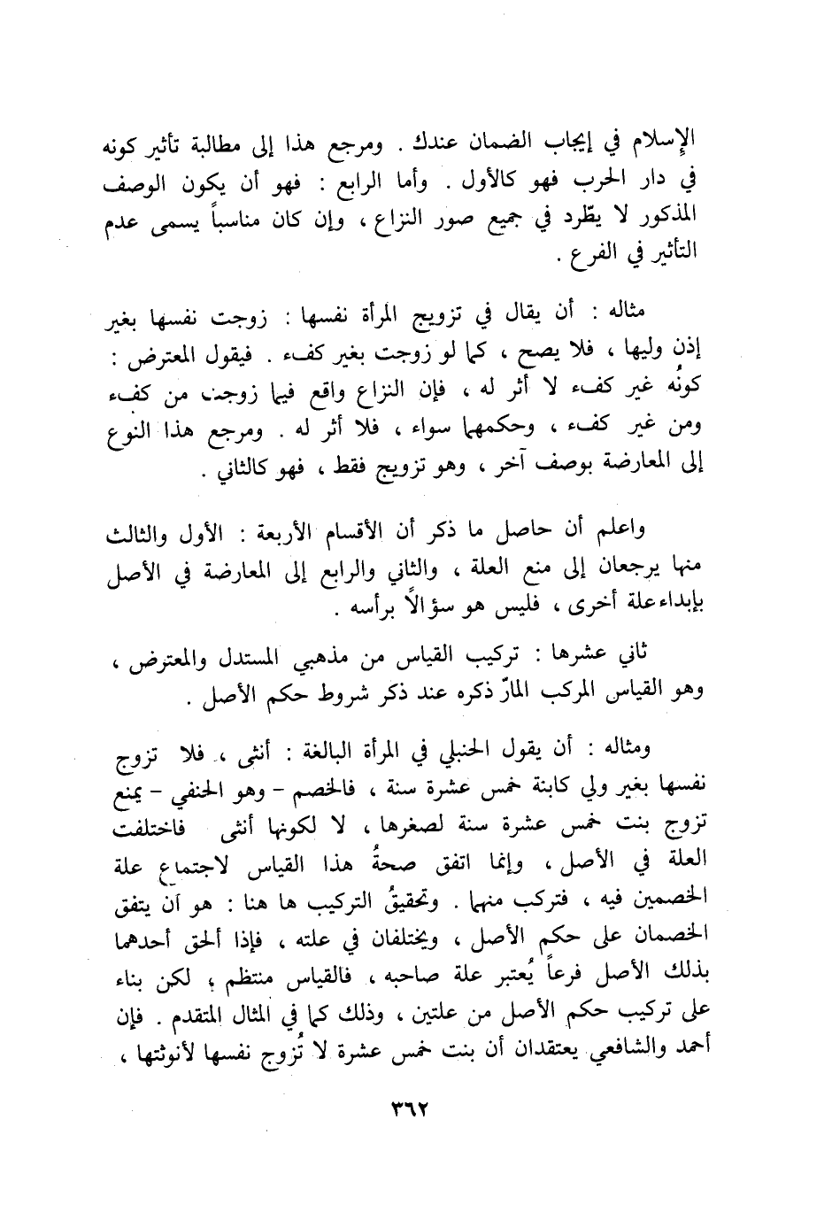 مِثَاله أَن يَقُول الْحَنَفِيّ فِي الْمَرْأَة الْبَالِغَة أُنْثَى فَلَا تزوج نَفسهَا بِغَيْر ولي كابنة خمس عشرَة سنة فالخصم وَهُوَ الْحَنَفِيّ يمْنَع تزوج بنت خمس عشرَة سنة لصغرها لَا لكَونهَا أُنْثَى فاختلفت الْعلَّة فِي الأَصْل وَإِنَّمَا اتّفق صِحَة هَذَا الْقيَاس لِاجْتِمَاع عِلّة الْخَصْمَيْنِ فِيهِ فتركب مِنْهُمَا وَتَحْقِيق التَّرْكِيب هَهُنَا هُوَ أَن يتَّفق الخصمان على حكم الأَصْل ويختلفان فِي علته فَإِذا ألحق أَحدهمَا بذلك الأَصْل فرعا يعْتَبر عِلّة صَاحبه فَالْقِيَاس مُنْتَظم لَكِن بِنَاء على تركيب حكم الأَصْل من علتين وَذَلِكَ كَمَا فِي الْمِثَال الْمُتَقَدّم فَإِن أَحْمد وَالشَّافِعِيّ يعْتَقد أَن بنت خمس عشرَة لَا تزوج نَفسهَا لأنوثتها