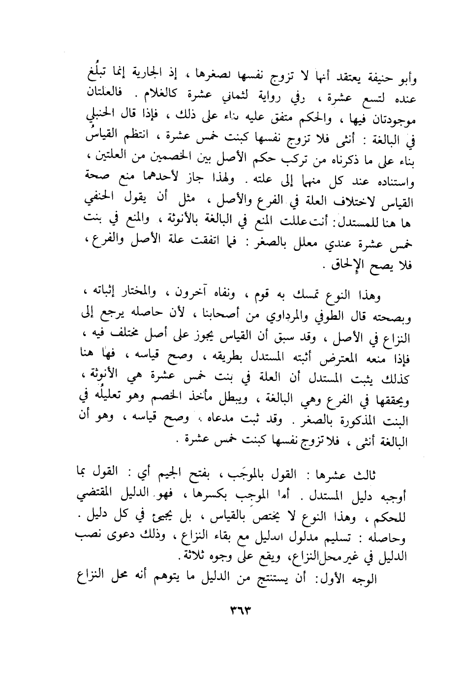 وَأَبُو حنيفَة يعْتَقد أَنَّهَا لَا تزوج نَفسهَا لصغرها إِذْ الْجَارِيَة إِنَّمَا تبلغ عِنْده لتسْع عشرَة وَفِي رِوَايَة لثماني عشرَة كالغلام فالعلتان موجودتان فِيهَا وَالْحكم مُتَّفق عَلَيْهِ بِنَاء على ذَلِك فَإِذا قَالَ الْحَنْبَلِيّ فِي الْبَالِغَة أُنْثَى فَلَا تزوج نَفسهَا كَبِنْت خمس عشرَة انتظم الْقيَاس بِنَاء على مَا ذَكرْنَاهُ من تركب حكم الأَصْل بَين الْخَصْمَيْنِ من العلتين واستناده عِنْد كل مِنْهُمَا إِلَى علته وَلِهَذَا جَازَ لأَحَدهمَا منع صِحَة الْقيَاس لاخْتِلَاف الْعلَّة فِي الْفَرْع وَالْأَصْل مثل أَن يَقُول الْحَنَفِيّ هَهُنَا للمستدل أَنْت عللت الْمَنْع فِي الْبَالِغَة بالأنوثة وَالْمَنْع فِي بنت خمس عشرَة عِنْدِي مُعَلل بالصغر فَمَا اتّفقت عِلّة الأَصْل وَالْفرع فَلَا يَصح الْإِلْحَاق