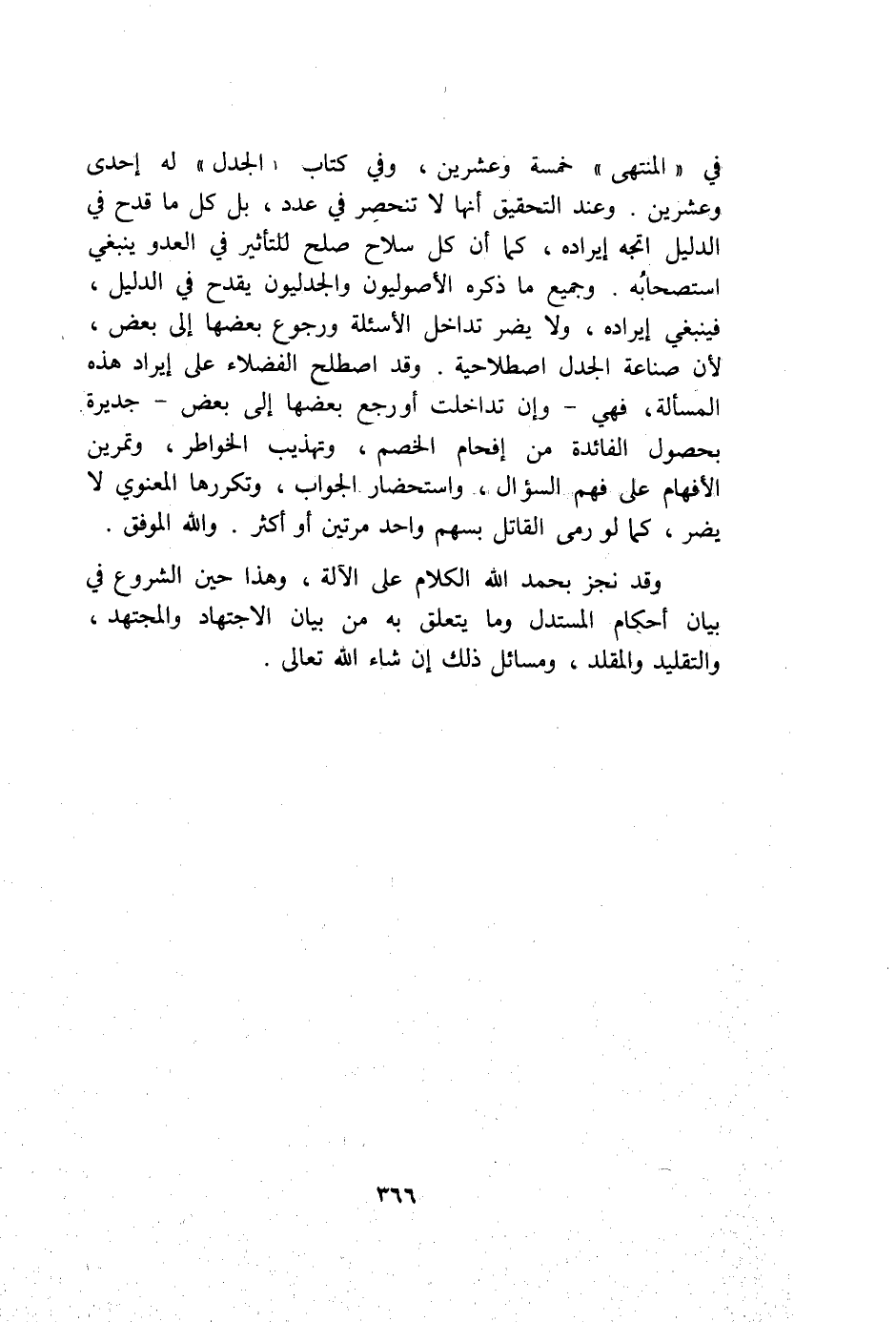 فِي الْمُنْتَهى خَمْسَة وَعشْرين وَفِي كتاب الجدل لَهُ إِحْدَى وَعشْرين وَعند التَّحْقِيق أَنَّهَا لَا تَنْحَصِر فِي عدد بل كل مَا قدح فِي الدَّلِيل اتجه إِيرَاده كَمَا أَن كل سلَاح صلح للتأثير فِي الْعَدو يَنْبَغِي استصحابه وَجَمِيع مَا ذكره الأصوليون والجدليون يقْدَح فِي الدَّلِيل فَيَنْبَغِي إِيرَاده وَلَا يضر تدَاخل الأسئلة وَرُجُوع بَعْضهَا إِلَى بعض لِأَن صناعَة الجدل اصطلاحية وَقد اصْطلحَ الْفُضَلَاء على إِيرَاد هَذِه الْمَسْأَلَة فَهِيَ وَإِن تداخلت أَو رَجَعَ بَعْضهَا إِلَى بعض جدد بِحُصُول الْفَائِدَة من إفحام الْخصم وتهذيب الخواطر وتمرين الأفهام على فهم السُّؤَال واستحضار الْجَواب وتكررها العنوي لَا يضر كَمَا لَو رمى الْقَاتِل بِسَهْم وَاحِد مرَّتَيْنِ أَو أَكثر وَالله الْمُوفق وَقد نجز بِحَمْد الله الْكَلَام على الْآلَة وَهَذَا حِين الشُّرُوع فِي بَيَان أَحْكَام الْمُسْتَدلّ وَمَا يتَعَلَّق بِهِ من بَيَان الِاجْتِهَاد والمجتهد والتقليد والمقلد ومسائل ذَلِك إِن شَاءَ الله تَعَالَى