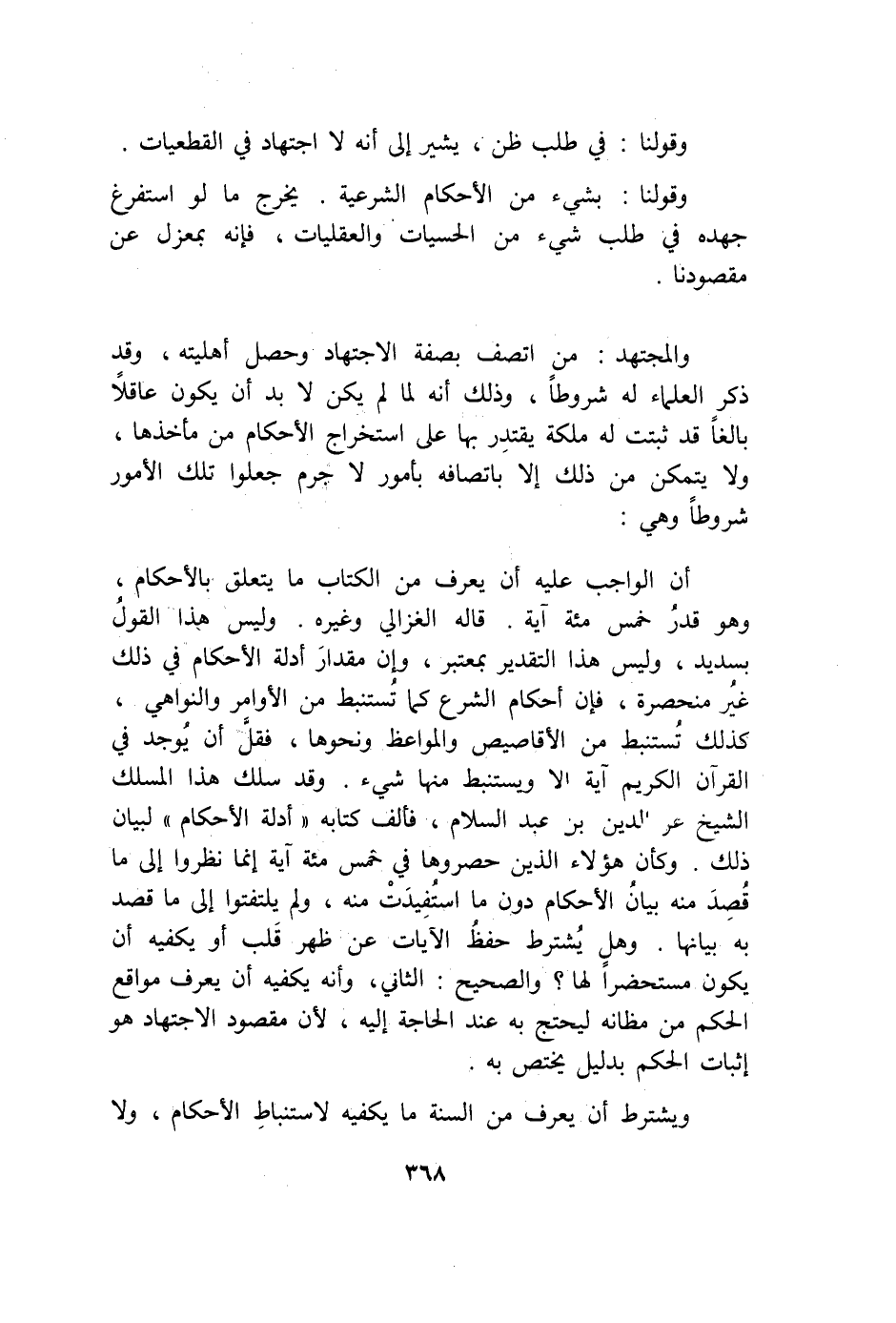 فَقل أَن يُوجد فِي الْقُرْآن الْكَرِيم آيَة إِلَّا ويستنبط مِنْهَا شَيْء وَقد سلك هَذَا المسلك الشَّيْخ عزالدين بن عبد السَّلَام فألف كِتَابه أَدِلَّة الْأَحْكَام لبَيَان ذَلِك وَكَانَ هَؤُلَاءِ الَّذين حصروها فِي خَمْسمِائَة آيَة إِنَّمَا نظرُوا إِلَى مَا قصد مِنْهُ بَيَان الْأَحْكَام دون مَا استفيدت مِنْهُ وَلم يلتفتوا إِلَى مَا قصد بِهِ بَيَانهَا وَهل يشْتَرط حفظ الْآيَات عَن ظهر قلب أَو يَكْفِيهِ أَن يكون مستحضرا لَهَا وَالصَّحِيح الثَّانِي وَأَنه يَكْفِيهِ أَن يعرف مواقع الحكم من مظانه ليحتج بِهِ عِنْد الْحَاجة إِلَيْهِ لِأَن مَقْصُود الِاجْتِهَاد هُوَ إِثْبَات الحكم بِدَلِيل يخْتَص بِهِ وَيشْتَرط أَن يعرف من السّنة مَا يَكْفِيهِ لاستنباط الْأَحْكَام وَلَا