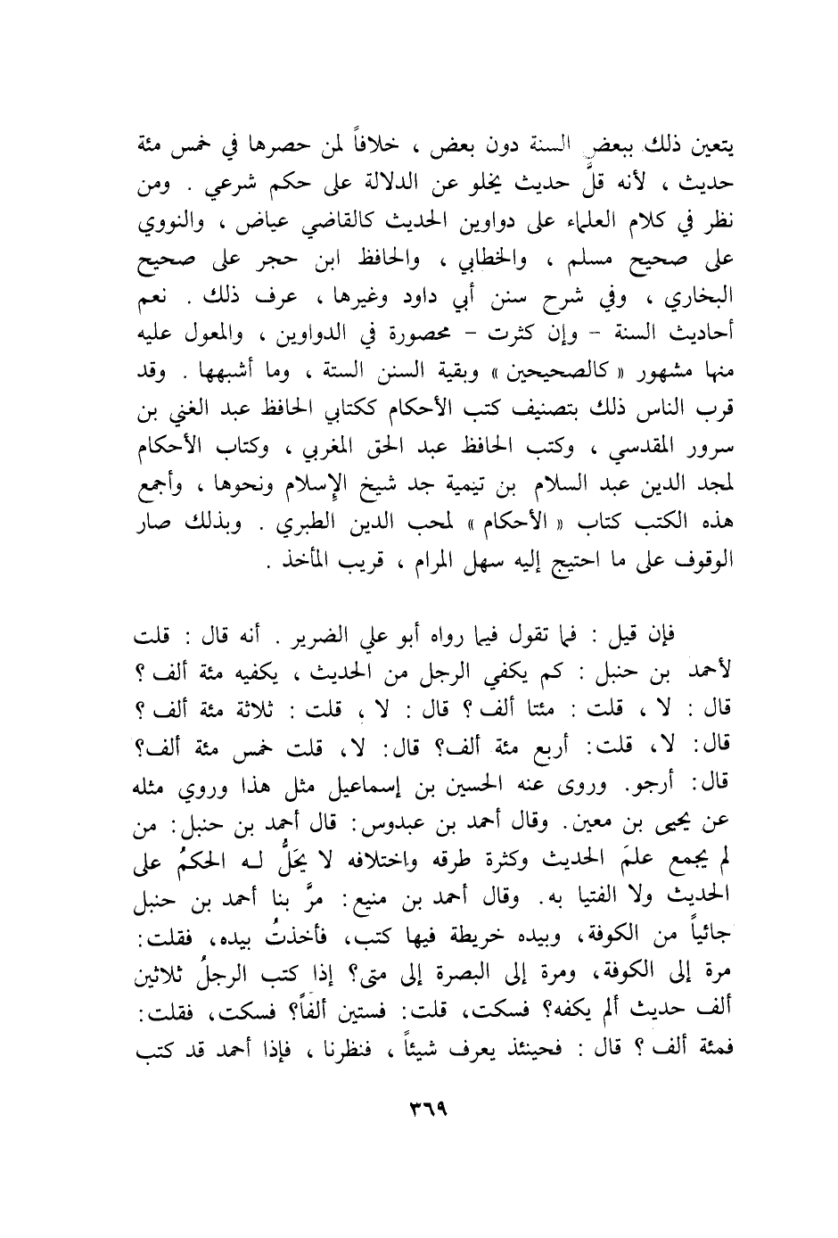 وَأجْمع هَذِه الْكتب كتاب الْأَحْكَام لمحب الدّين الطَّبَرِيّ وَبِذَلِك صَار الْوُقُوف على مَا احْتِيجَ إِلَيْهِ سهل المرام قريب المأخذ فَإِن قيل فَمَا تَقول فِيمَا رَوَاهُ أَبُو عَليّ الضَّرِير أَنه قَالَ قلت لِأَحْمَد بن حَنْبَل كم يَكْفِي الرجل من الحَدِيث يَكْفِيهِ مائَة ألف قَالَ لَا قلت مِائَتَا ألف قَالَ لَا قلت ثَلَاثمِائَة ألف قَالَ لَا قلت أَرْبَعمِائَة ألف قَالَ لَا قلت خَمْسمِائَة ألف قَالَ أَرْجُو