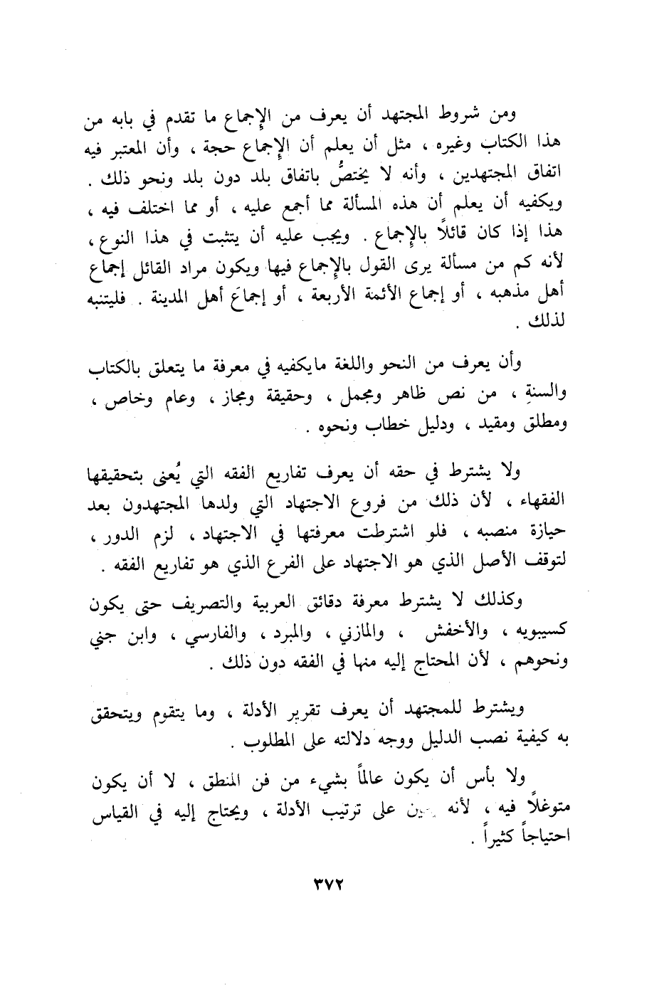 وَلَا يشْتَرط فِي حَقه أَن يعرف تفاريع الْفِقْه الَّتِي يعْنى بتحقيقها الْفُقَهَاء لِأَن ذَلِك من فروع الِاجْتِهَاد الَّتِي وَلَدهَا المجتهدون بعد حِيَازَة منصبه فَلَو اشْترطت مَعْرفَتهَا فِي الِاجْتِهَاد لزم الدّور لتوقف الأَصْل الَّذِي هُوَ الِاجْتِهَاد على الْفَرْع الَّذِي هُوَ تفاريع الْفِقْه وَكَذَلِكَ لَا يشْتَرط معرفَة دقائق الْعَرَبيَّة والتصريف حَتَّى يكون كسيبويه والأخفش والمازني والمبرد والفارسي وَابْن جني وَنَحْوهم لِأَن الْمُحْتَاج إِلَيْهِ مِنْهَا فِي الْفِقْه دون ذَلِك وَيشْتَرط للمجتهد أَن يعرف تَقْرِير الْأَدِلَّة وَمَا يتقوم ويتحقق بِهِ كَيْفيَّة نصب الدَّلِيل وَوجه دلَالَته على الْمَطْلُوب وَلَا بَأْس أَن يكون عَالما بِشَيْء من فن الْمنطق لَا أَن يكون متوغلا فِيهِ لِأَنَّهُ يعين على تَرْتِيب الْأَدِلَّة وَيحْتَاج إِلَيْهِ فِي الْقيَاس احتياجا كثيرا