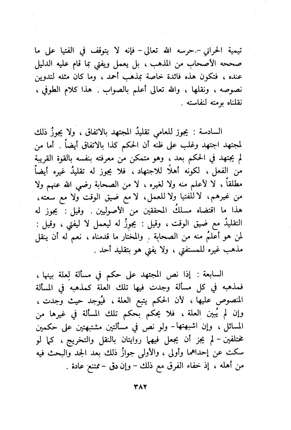 تَيْمِية الْحَرَّانِي حرسه الله تَعَالَى فَإِنَّهُ لَا يتوفق فِي الْفتيا على مَا صَححهُ الْأَصْحَاب من الْمَذْهَب بل يعْمل ويفتي بِمَا قَامَ عَلَيْهِ الدَّلِيل عِنْده فَتكون هَذِه فَائِدَة خَاصَّة بِمذهب أَحْمد وَمَا كَانَ مثله لتدوين نصوصه ونقلها وَالله تَعَالَى أعلم بِالصَّوَابِ هَذَا كَلَام الطوفي نَقَلْنَاهُ برمتِهِ لنفاسته