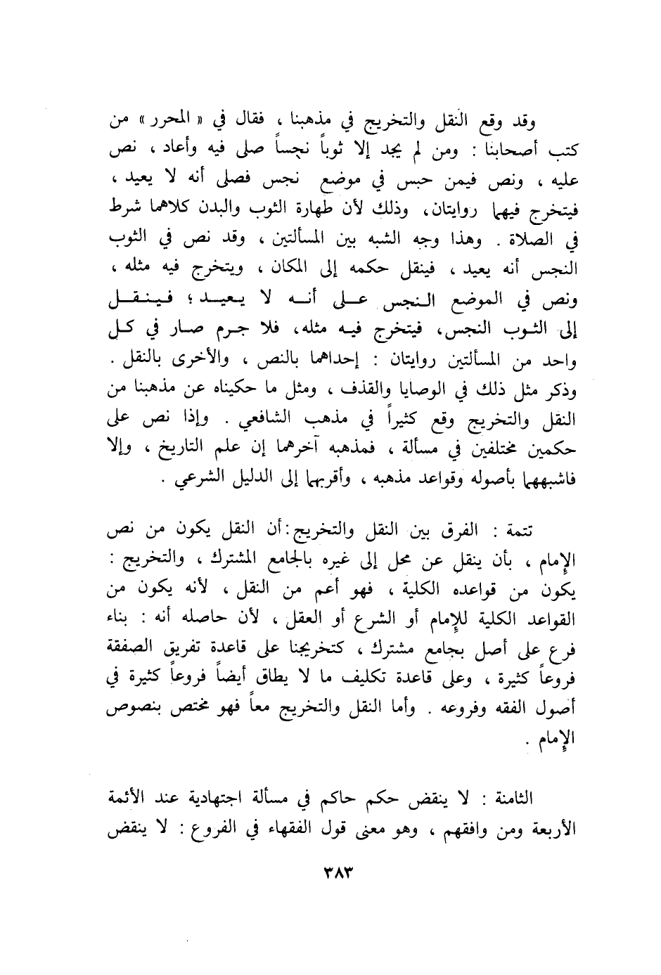 وَقد وَقع النَّقْل والتخريج فِي مَذْهَبنَا فَقَالَ فِي الْمُحَرر من كتب أَصْحَابنَا وَمن لم يجد إِلَّا ثَوابًا نجسا صلى فِيهِ وَأعَاد نَص عَلَيْهِ وَنَصّ فِيمَن حبس فِي مَوضِع نجس فصلى أَنه لَا يُعِيد فيتخرج فيهمَا رِوَايَتَانِ وَذَلِكَ لِأَن طَهَارَة الثَّوْب وَالْبدن كِلَاهُمَا شَرط فِي الصَّلَاة وَهَذَا وَجه الشّبَه بَين الْمَسْأَلَتَيْنِ وَقد نَص فِي الثَّوْب النَّجس أَنه يُعِيد فينقل حكمه إِلَى الْمَكَان وَيتَخَرَّج فِيهِ مثله وَنَصّ فِي الْموضع النَّجس على أَنه لَا يُعِيد فينقل إِلَى الثَّوَاب النَّجس فيتخرج فِيهِ مثله فَلَا جرم صَار فِي كل وَاحِدَة من الْمَسْأَلَتَيْنِ رِوَايَتَانِ إِحْدَاهمَا بِالنَّصِّ وَالْأُخْرَى بِالنَّقْلِ وَذكر مثل ذَلِك فِي الْوَصَايَا وَالْقَذْف وَمثل مَا حكيناه عَن مَذْهَبنَا من النَّقْل والتخريج وَقع كثيرا فِي مَذْهَب الشَّافِعِي وَإِذا نَص على حكمين مُخْتَلفين فِي مَسْأَلَة فمذهبه آخرهما أَن علم التَّارِيخ وَإِلَّا فأشبههما بأصوله وقواعد مذْهبه وأقربهما إِلَى الدَّلِيل الشَّرْعِيّ