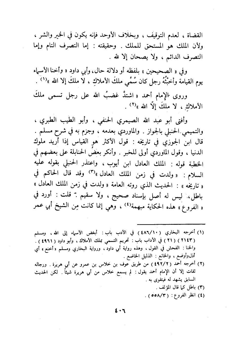 الْقُضَاة لعدم التَّوْقِيف وَبِخِلَاف الأوحد فَإِنَّهُ يكون فِي الْخَيْر وَالشَّر وَلِأَن الْملك هُوَ الْمُسْتَحق لمَالِك وَحَقِيقَته إِمَّا التَّصَرُّف التَّام وَإِمَّا التَّصَرُّف الدَّائِم وَلَا يصحان إِلَّا لله وَفِي الصَّحِيحَيْنِ بِلَفْظِهِ أَو دلَالَة حَال وَأبي دَاوُد وأخنا الْأَسْمَاء يَوْم الْقِيَامَة وأخبثه رجل كَانَ سمي ملك الْأَمْلَاك لَا ملك إِلَّا الله وروى الإِمَام أَحْمد اشْتَدَّ غضب الله على رجل تسمى ملك الْأَمْلَاك لَا ملك إِلَّا الله